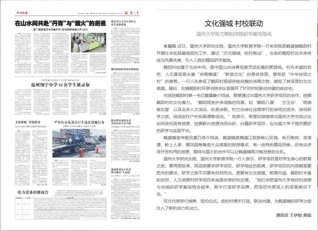 鹤盛镇宣传委员董乃菲介绍说,鹤盛镇是楠溪江旅游核心区域,有石桅岩、龙湾潭、岭上人家、樱花园等备受大众喜爱的旅游景点,有一批特色精品民宿,还有众多待开发利用的资源,期待与温大的合作可以让鹤盛镇再次焕发新的生机。