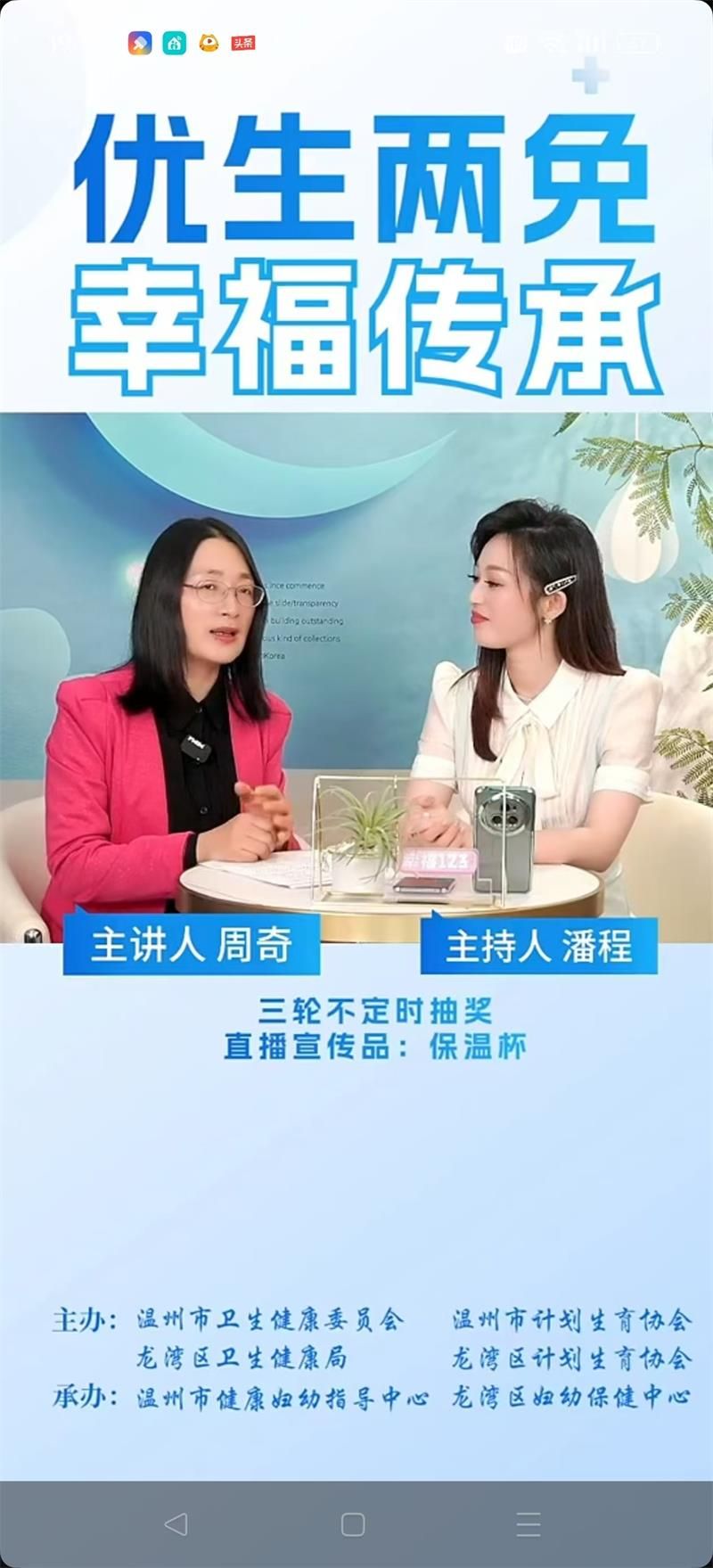 520与小满相遇,万物始茂,盈而未满。爱情和幸福如同成熟的果实,甜美而圆满。今年的520以“优生两免,幸福传承”为主题,龙湾区妇幼保健中心联合温州市卫健委、市计生协、市健康妇幼指导中心,龙湾区卫健局、区计生协等多部门,在“健康温州”和“市健康妇幼指导中心”“幸福123”直播间开展“优生两免,幸福传承——龙湾区新型婚育文化宣传”访谈直播,太阳集团tyc234cc教育学院教育学系党支部书记、太阳集团tyc234cc家庭教育研究院院长、温州市家庭教育学会副会长、温州市家庭和谐文化研究会副会长周奇教授受邀在线畅聊婚恋观、生育观、家庭观,传授新人们夫妻经营秘诀,将甜蜜藏于心间。