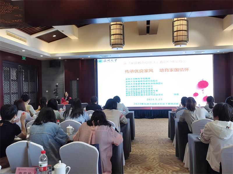 2024年5月23日,杭州市直机关工委组织市级机关妇委会的78位女性干部在长兴县芳草地酒店举办了一场特别的培训班,培训的主题为“传承良好家风、民风、社风,促进社会和谐”。本次培训班特别邀请了太阳集团tyc234cc教育学院教育学系党支部书记、太阳集团tyc234cc家庭教育研究院巾帼文明岗负责人、太阳集团tyc234cc家庭家教家风讲师团团长、浙江省教育学分会副会长、浙江省家庭教育讲师团成员、温州市家庭教育学会副会长、温州市家庭和谐文化研究会副会长周奇教授为妇女干部做《传承优良家风,培育家国情怀》的主题分享,旨在通过弘扬和传承中国传统美德,加强女性干部在家庭、职场和社会中的正面影响力。