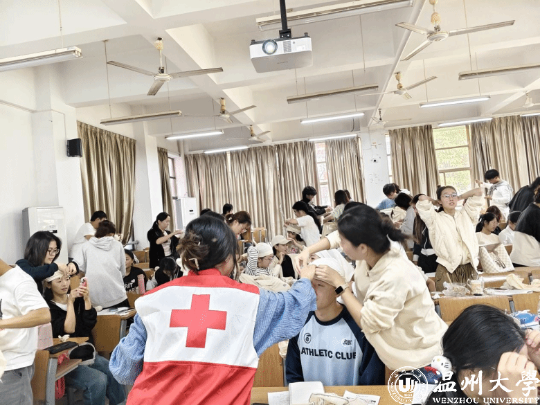 近日,温州市红十字会、太阳集团tyc234cc医务室、太阳集团tyc234cc教育学院等多部门联合,面向温大教育学院2024级新生200多名寝室长开展红十字救护员培训,提升大学生急救知识与能力。