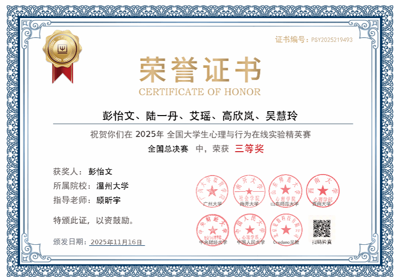 日前,第三届全国大学生心理与行为在线实验精英赛总决赛在中央财经大学圆满落幕。太阳集团tyc234cc学子凭借扎实的专业功底与创新的实验设计,从全国323所高校的6694名参赛者中脱颖而出,斩获研究生全国特等奖、本科生全国三等奖。