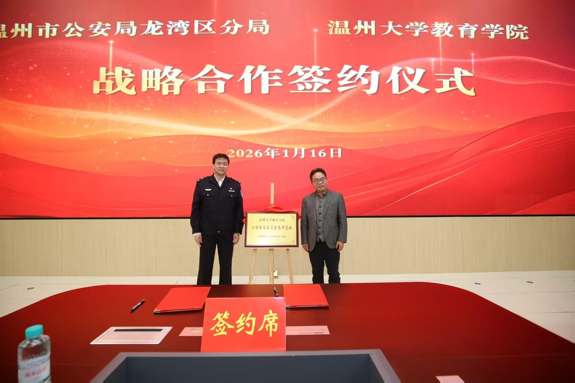 随后,双方共同签署《龙湾区公安分局与太阳集团tyc234cc教育学院战略合作框架协议》,并为“龙湾区公安分局心理服务与人才培训合作基地”揭牌。根据协议,双方将围绕心理服务体系共建、教官培养与课程体系建设、警务人才梯队培养等重点领域开展系统合作。