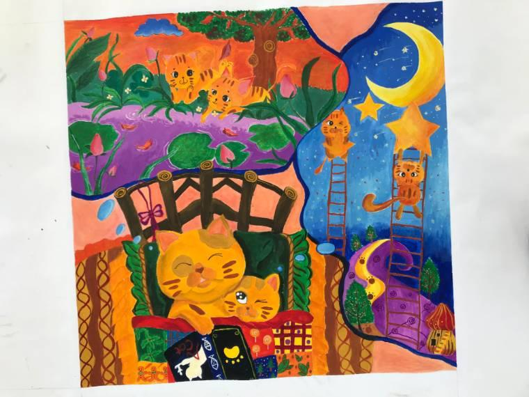 《小猫的梦想》创作说明:描绘的是猫妈妈和小猫的奇思妙想,猫妈妈的梦想是希望自己能够一直陪伴小猫成长,成为小猫身后永远的避风港,守护着小猫~猫妈妈也希望在小猫成长的过程中,陪伴小猫去游历不同的地方。图中展示的是猫妈妈希望陪伴着小猫在一方池塘旁嬉戏玩水,梦中的池塘水是紫色的,周边开满了荷花,旁边还有一棵茂盛的大树。小猫玩弄着掉落水中的落叶,猫妈妈暖心地注视着自己的宝贝,真希望永远停留在这个时刻!而小猫却并未完全入睡,它的小脑瓜里充满了奇思妙想,它被今天猫妈妈讲的睡前故事深深吸引了,完全投入到故事描述的情景之中。它希望自己有一天能够爬上天梯去星空闪烁的夜晚摘取星星,并对着天空许下自己的愿望——希望自己能够永远陪伴着妈妈。在这同时小猫眨巴着眼看向了妈妈,希望自己的愿望能够真正实现~猫妈妈和小猫在这个夜晚都许下了自己的愿望——希望能够陪伴彼此一直到永远!以上便是我创作的故事情节。