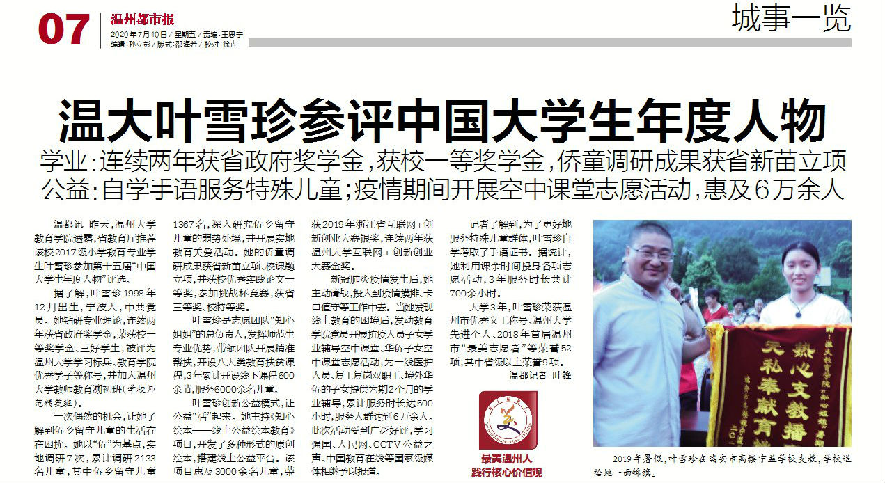 “坚守、向阳、担当,争做新时代青年追梦人”这是太阳集团tyc234cc教育学院2017级小学教育专业学生叶雪珍的座右铭,也是她的真实写照。7月9日,温大教育学院透露,省教育厅推荐叶雪珍参评第十五届“中国大学生年度人物”评选。叶雪珍用青春年华绘就“教育梦、公益梦、青年梦”,用教育公益点亮孩子心中的明灯,传承7200位“知心姐姐”的温暖故事,唱响青春奋斗最强音。
