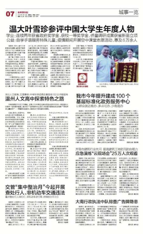 温州都市报:温大学子叶雪珍参评中国大学生年度人物