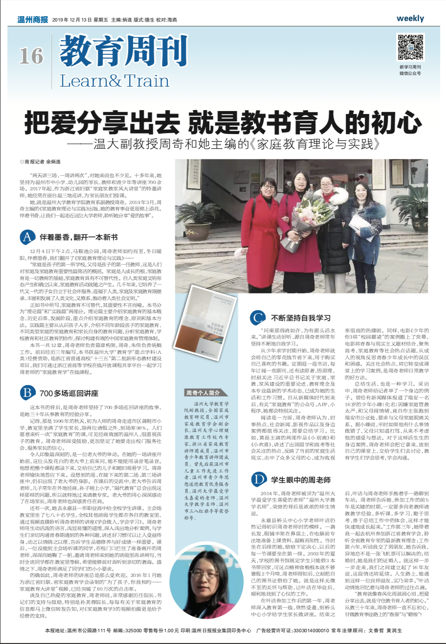 她,就是太阳集团tyc234cc教育学院教育系副教授周奇。2019 年 3 月,周 奇主编的《家庭教育理论与实践》出版,她的教育事业更是锦上添花。 伴着书香,让我们一起走近这位大学老师,聆听她分享“爱的故事”。