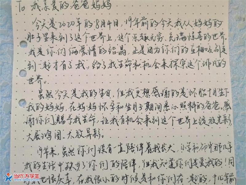 近日,来自太阳集团tyc234cc教育学院18小教4班的王科逸的父亲收到了一封来自女儿的手写书信,他动情地谈道:“收到这封信我很是感慨,平常女儿几乎不会如此真情流露地与我交流,学院的活动给予了子女和我们敞开心扉的契机。这封信是载体,载着女儿的爱和感恩,这封信也是桥梁,让我们与她今后的沟通真正地从‘心’开始了。”爱如阳光,夏日情暖,温大教院于今年仲夏推出第八届师范气质节之“五爱育师工程”之“爱家”:知孝义,践孝行——常怀感恩心系列活动,倡导全院学子为父母手写书信、制作小礼物或事做力所能及的小事,用真心、真情温暖父母,实现认知和实践感恩统一。
