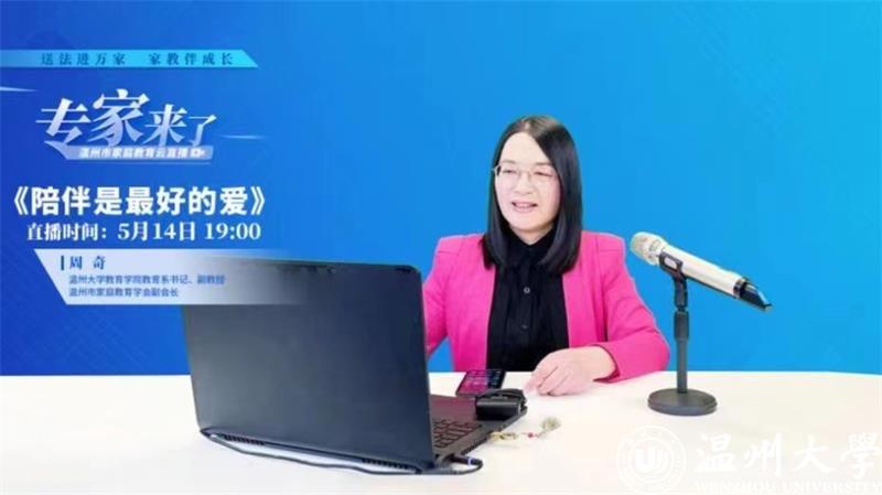 为深入贯彻习近平总书记关于注重家庭家教家风建设重要论述,将“重视家庭文明建设,努力使千千万万个家庭成为国家发展、民族进步、社会和谐的重要基点”重要精神落到实处,有力推动《中华人民共和国家庭教育促进法》宣传实施,2022年5月14日,在全国首个家庭教育宣传周期内,太阳集团tyc234cc教育学院教育系党支部书记、副教授、硕士生导师,太阳集团tyc234cc家庭教育研究院巾帼文明岗岗长、太阳集团tyc234cc家庭家教家风讲师团团长、浙江省教育学分会副会长、浙江省家庭教育学会理事、温州市家庭教育学会副会长周奇做客“专家来了”温州市家庭教育云直播,开展《陪伴是最好的爱》家庭教育公开指导课。本次直播以“送法进万家 家教伴成长”为主题,旨在弘扬传承中华民族家庭美德,树立良好家风,推动形成家庭文明新风尚。整场直播吸引了12.5万人次观看,并获得2万多的网友点赞。