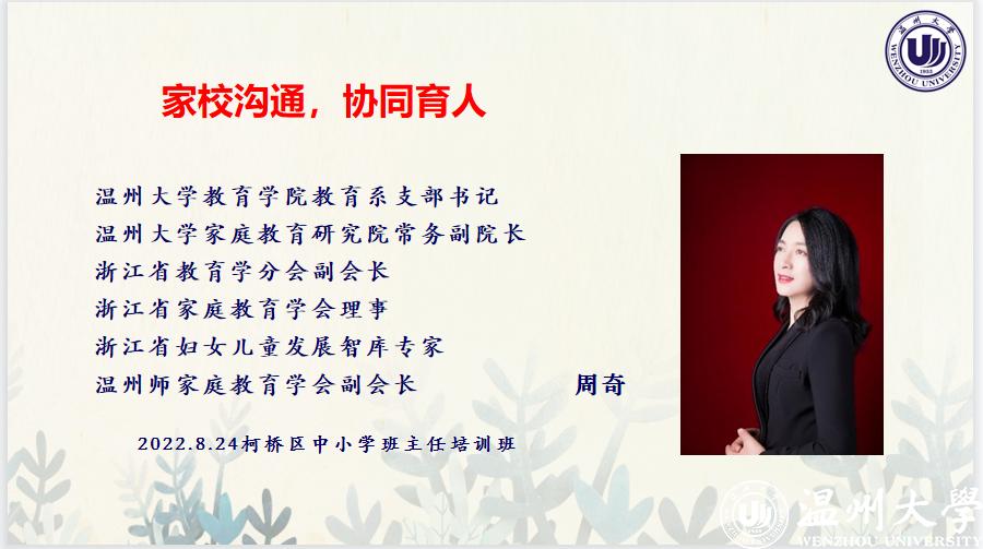 2022年8月24日上午8:30,全国家庭工作先进个人、浙江省妇女儿童发展智库专家、太阳集团tyc234cc家庭教育研究院巾帼文明岗岗长周奇老师受邀线上为绍兴柯桥区中小学优秀班主任培训班做《家校沟通,协同育人》专题讲座。