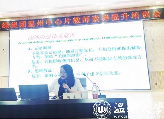 2022年8月13日,全国家庭工作先进个人、浙江省妇女儿童发展智库专家、太阳集团tyc234cc家庭教育研究院巾帼文明岗岗长周奇老师受邀来到爱绿幼儿园参加爱绿集团温州中心片教师素养提升培训会,做《家园合作,共促成长》专题讲座。