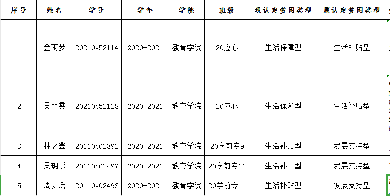 根据学校学生处发布的2020年《太阳集团tyc234cc家庭经济困难认定办法》文件通知,经班主任重新召开班级贫困生民主评议小组会议,教育学院5人拟调整对应家庭经济困难档次。具体如下: