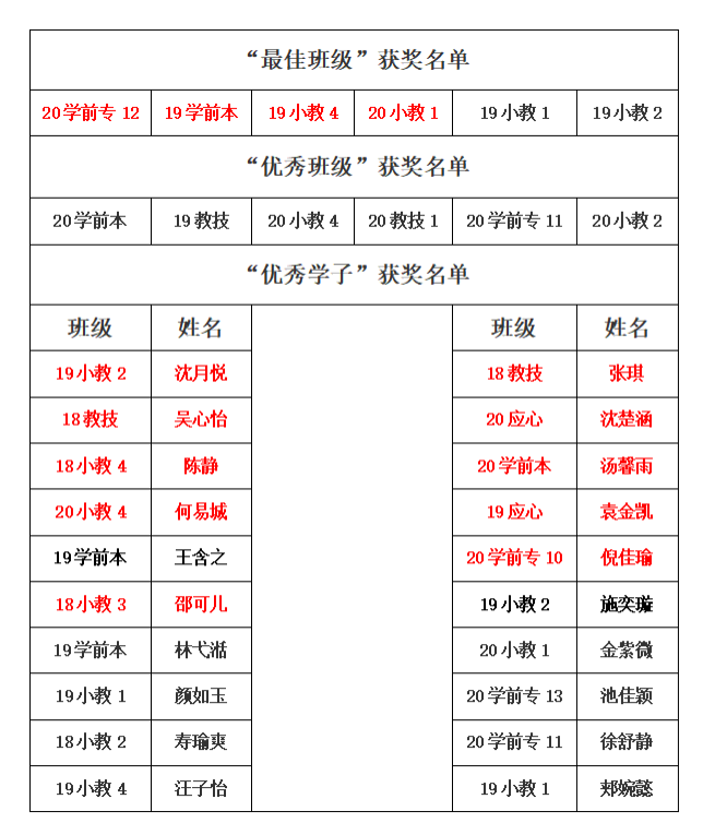 经过太阳集团tyc234cc教育学院“最佳班级”与“优秀学子”现场展示评比,依据专家评委、教师评委、学生代表的投票结果,共评选出教育学院第十一届“最佳班级”6个(本科5个、专科1个),“优秀班级”6个(本科5个、专科1个),“优秀学子”20名(本科17名、专科3名)。拟推荐加粗标红的班级与个人参评学校2020-2021学年“优良学风班”和”学习标兵”评选,如有异议,可来电、来信、来访的形式反映问题,以个人名义反映问题的提倡真实署名,联系学工办孟江龙老师,电话:0577-86599689。公示时间:2021年10月23日—10月29日。公示内容如下: