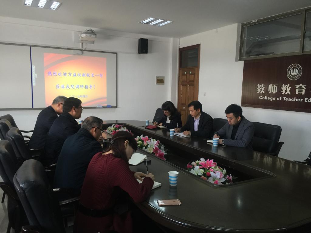 4月1日上午,方益权副校长率校教师教学发展中心主任、教务处副处长孙芙蓉,人事处副处长蒋俊莅临我院调研指导,学院领导郑信军、潘玉进、彭小明、杨丽君等参加了此次调研。