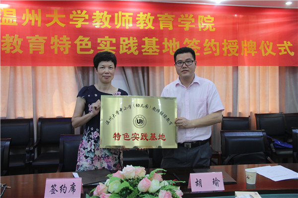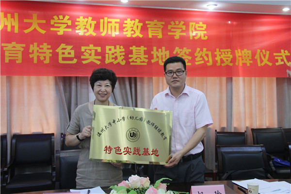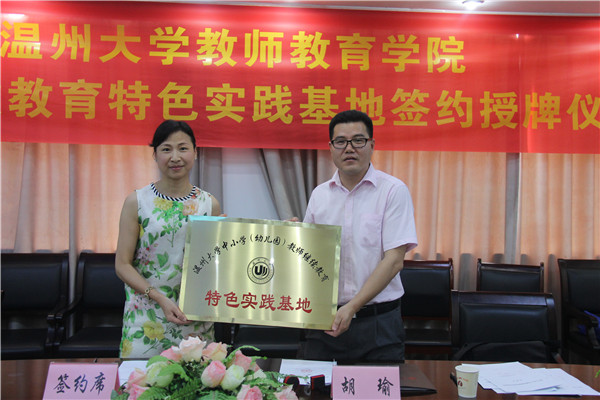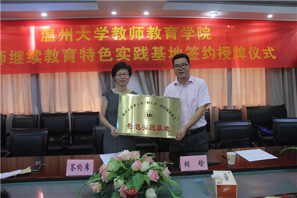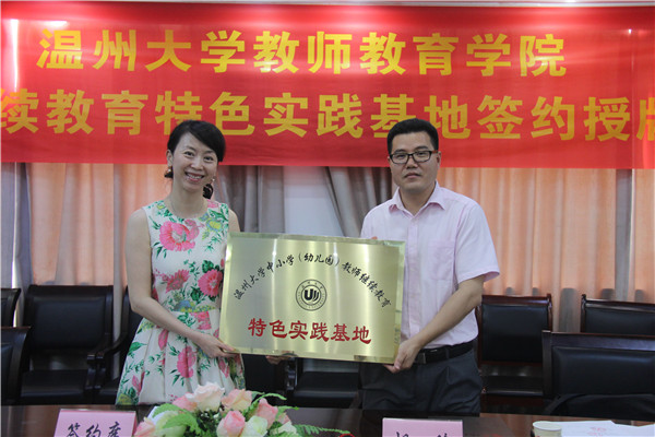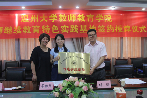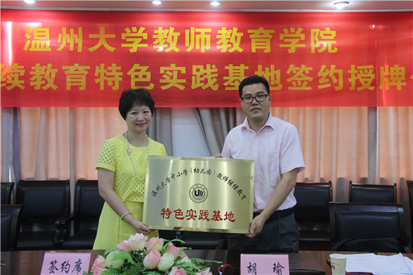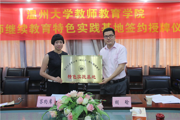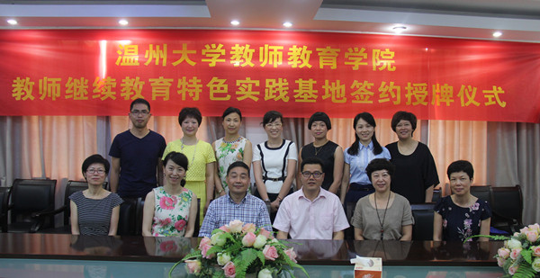 2015年6月30日上午,太阳集团tyc234cc中小学教师继续教育特色实践基地签约授牌仪式在太阳集团tyc234cc学院路校区举行。来自温州市基础教育界10位项目负责人,代表各自所在的中小学及幼儿园参加了本次仪式,太阳成集团tyc234cc副院长胡瑜作为学院代表出席仪式,仪式由太阳成集团tyc234cc继续教育科科长林鹣鹣老师主持。
