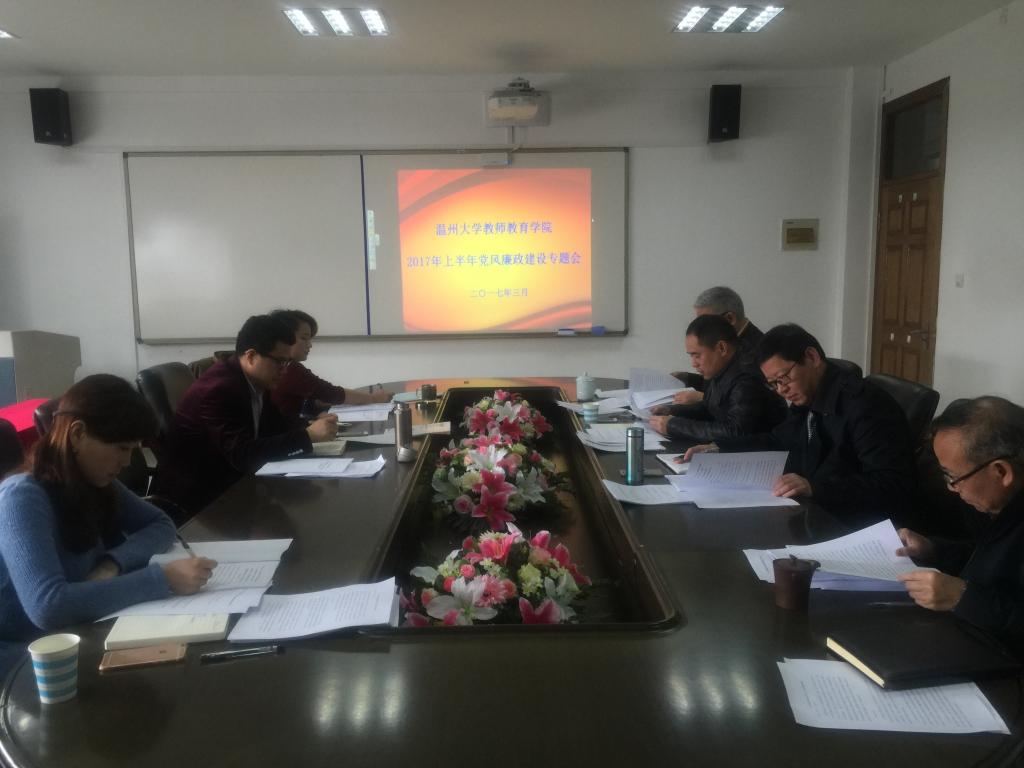 3月31日上午,我院在南校区9A410会议室召开学院2017年上半年党风廉政建设专题会,学院领导班子成员、学院党总支委员参加了本次会议。学院党总支书记杨立淮主持。