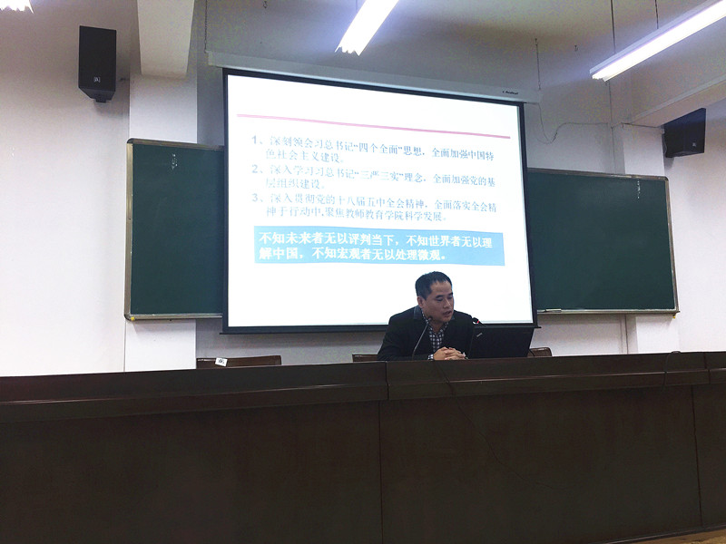 杨立淮书记在本次大会上做十八届五中全会精神解读的辅导报告。他从“户口”“教育”“就业”“二孩”“收入”“脱贫”“科研”“价格”“环保”“社保”等广大教师关心的关键词切入,为大家认真解读了十八届五中全会公报。他在报告的结尾,以“不知未来者无以评判当下,不知世界者无以理解中国,不知宏观者无以处理微观”这句话与大家共勉,号召全体教师要深刻领会习近平总书记“四个全面”思想,全面加强中国特色社会主义建设;要深入学习习近平总书记“三严三实”理念,全面加强党的基层组织建设;深入贯彻党的十八届五中全会精神,全面落实全会精神于行动中,聚焦太阳成集团tyc234cc科学发展。