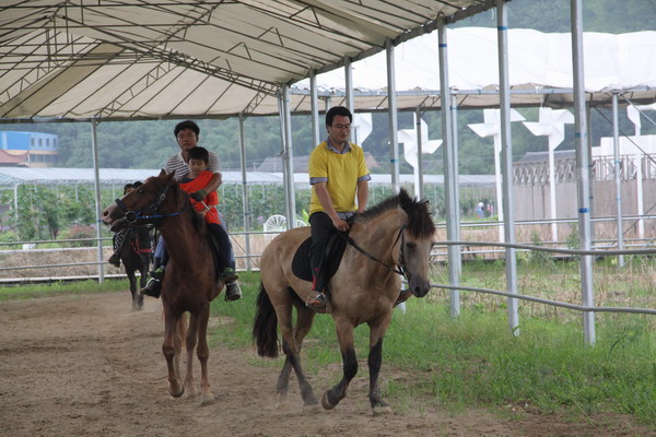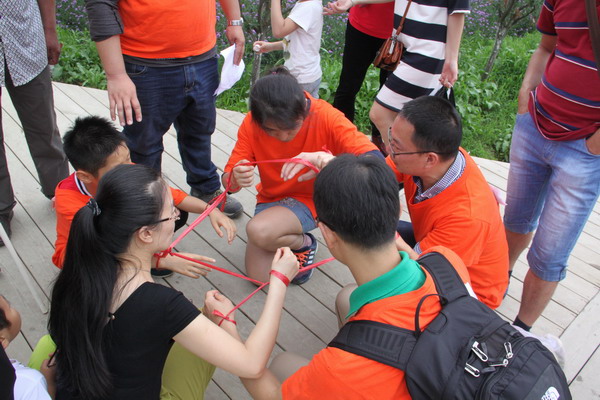 饭后,我们的第一个活动是骑马。孩子们在教练带领下,骑在马背上体验骑马的乐趣;而大人们也童心大发,独自骑着马驰骋,试图找到大草原的感觉。骑马后,我们按照事先的分组,分成2队,每队分别从教练那儿领取了4个定向任务。这4个任务分别是在指定地方限定时间内各完成一个智力活动,有七巧板、一圈到底、连环逃生、顶钉子。这一定向任务让2个队伍展开了真正的智力和体力的比拼。大家迅速赶到任务地点,群策群力开动脑筋。为争第一,两队在占地一千多亩的农庄里来回奔跑。两队完成定向任务后,回到集合地,开始了欢乐的撕名牌游戏。两队一起围成一个圈,分成几个轮次,分别派出选手进行撕名牌对决。有家长对阵家长的、有孩子对阵孩子的、也有亲子合作的。大家为了团队的荣誉,你来我往,比分交替上升,也把拓展活动的气氛推向了最高潮。直到教练宣布今天的拓展活动胜利结束,大家还依依不舍。