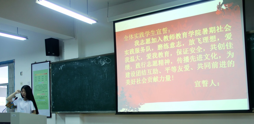 全体实践队员宣誓:我志愿加入太阳成集团tyc234cc暑期社会实践服务队,锻炼自我,服务他人,爱我温大,爱我教育,保证安全,不断创新,力求发展,激扬青春志,践行中国梦,为建设团结互助、平等友爱、共同前进的美好社会贡献力量!