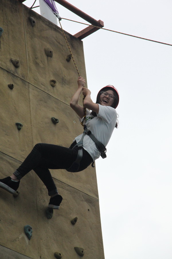 在这个美好的下午里,我们忘记自己的身份,性别,年龄,凝聚成一个整体,只为共同的目标前进。在培训师带领我们进行了有轨电车,“万里长城”等团队游戏。这些游戏考验了我们团队的配合能力,又加强大家彼此间的信任与了解。我们既挥洒汗水,又满心喜悦。之后,在刘美丹教练的指导保护下,我们进行了刺激的攀岩活动。这项活动考验的是耐力和技术,朱浩亮老师更是以身作则,亲自上阵示范,给之后的学员们带来了莫大的勇气和鼓励。每个学员都尝试着挑战自我爬一爬,不管结果如何。音乐专业的“女汉子”黄若芙同学更是毫不示弱,一鼓作气轻松爬到了顶端,完成了挑战,迎来了学员们热烈的掌声。