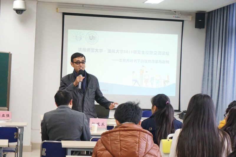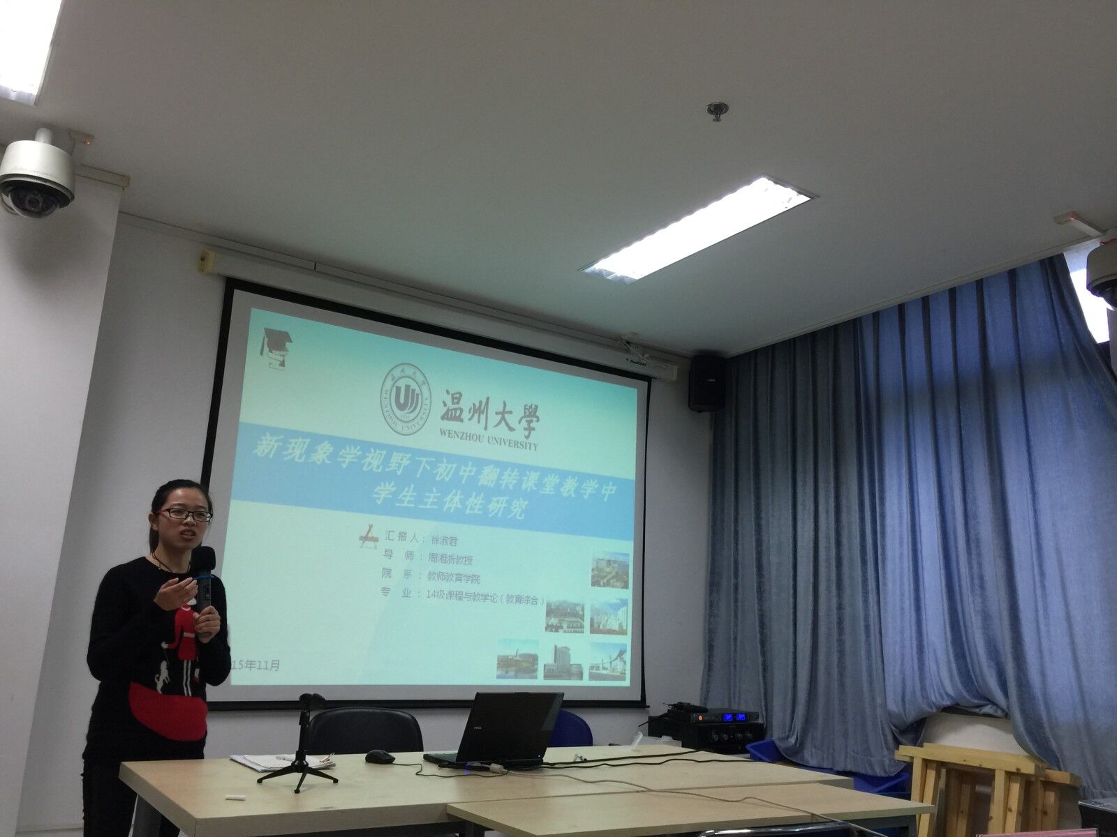 此次校际交流论坛由我院研会主席王庆超与杭师大教育学院研会主席姜霞主持。会议伊始,杭师大仲玉英院长致欢迎辞,折延东老师对温杭校际交流会的历史渊源做简单介绍并预祝此次交流圆满成功。会中,双方研究生依次交流了各自关注的学术问题,新颖独特的研究视角、丰富多样的研究内容以及汇报同学激情澎湃的论述、台下同学踊跃的提问质疑,无不吸引着与会者的眼球,会场学术氛围甚浓。师生们从研究内容、研究方法、研究视角、应用前景等方面聚集互联网时代下教育的改革与创新。会议在徐淑君同学的“新现象学视野下初中翻转课堂教学中学生主体性研究”中步入高潮,张华老师从跨学科意识、鲜明的问题意识、创造的意识三方面对此研究给与较高的评价与肯定,同学们也纷纷赞同。这让我们对互联网时代下教育的改革创新与跨学科的研究意识有了新的感悟与收获。