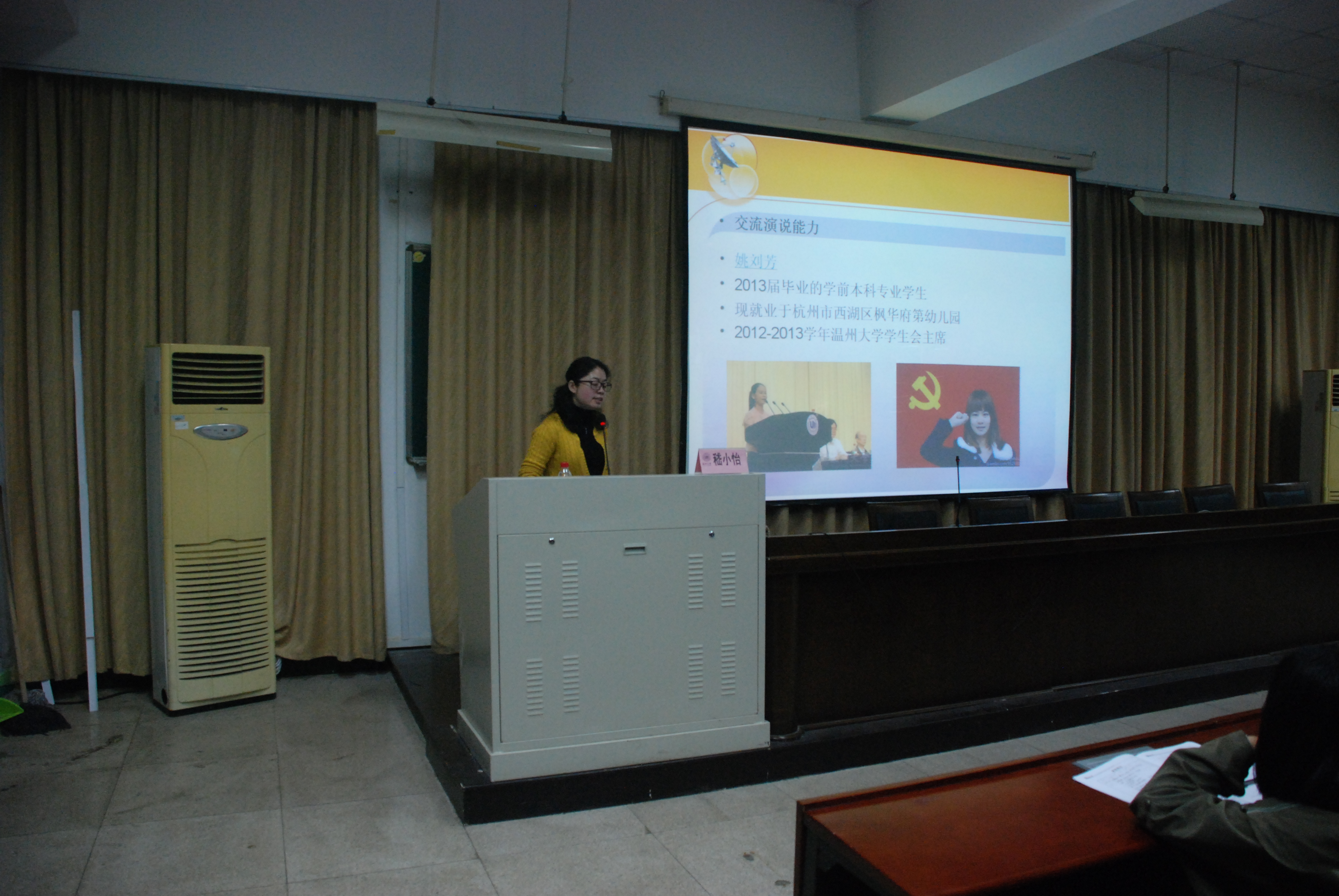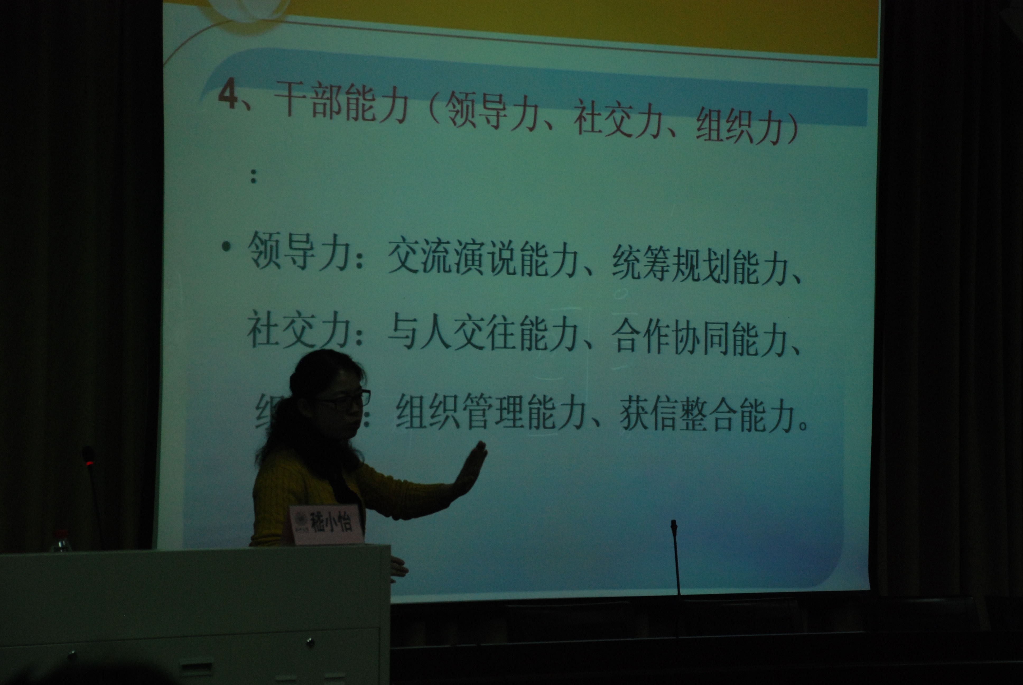 2013年12月6日晚在3号楼101教室进行了太阳成集团tyc234cc团干培训的最后一次培训:干部的魅力——气质与涵养,主讲人为太阳成集团tyc234cc党总支副书记嵇小怡老师,参加本次培训的同学为全体学生干部。