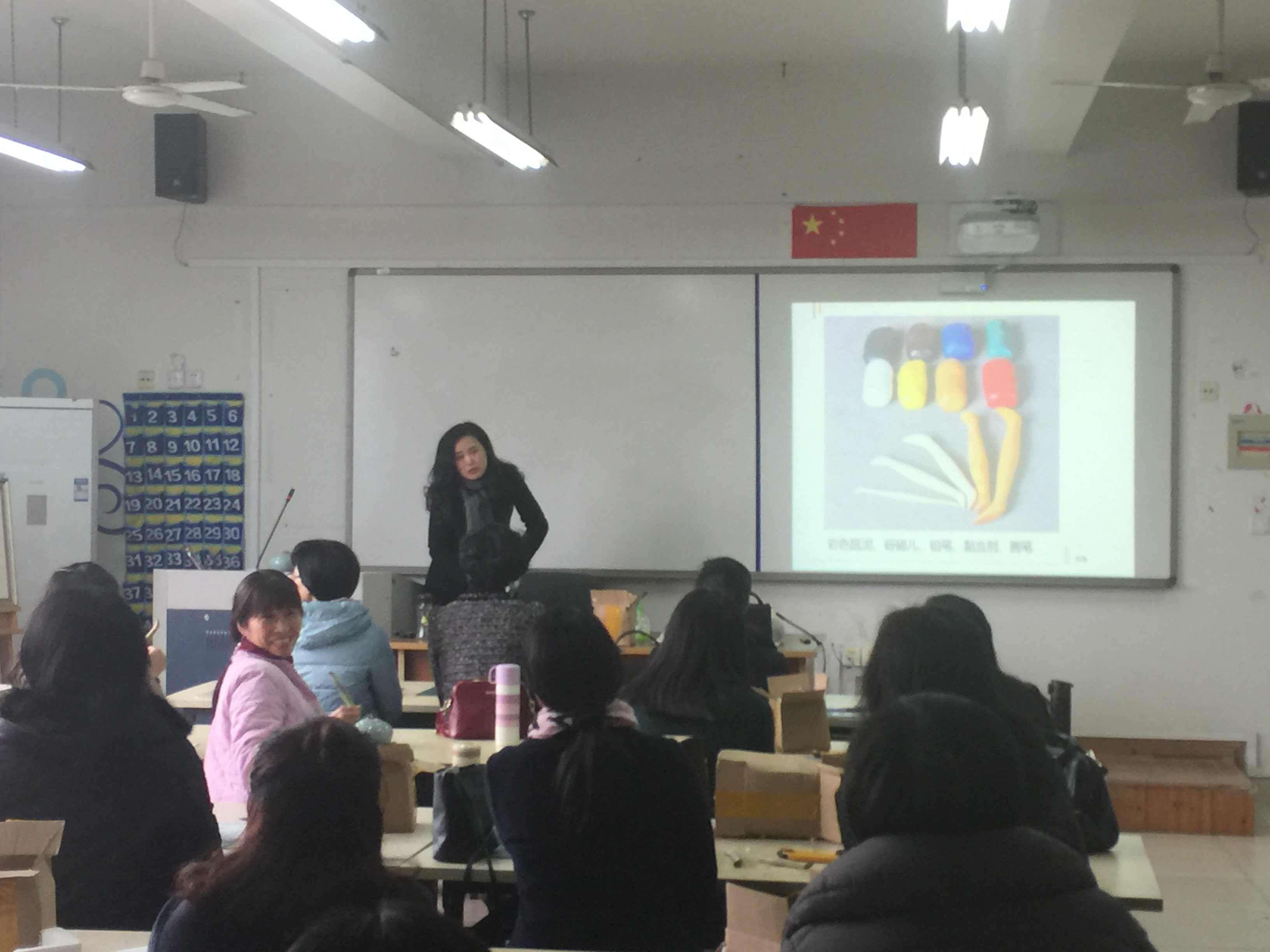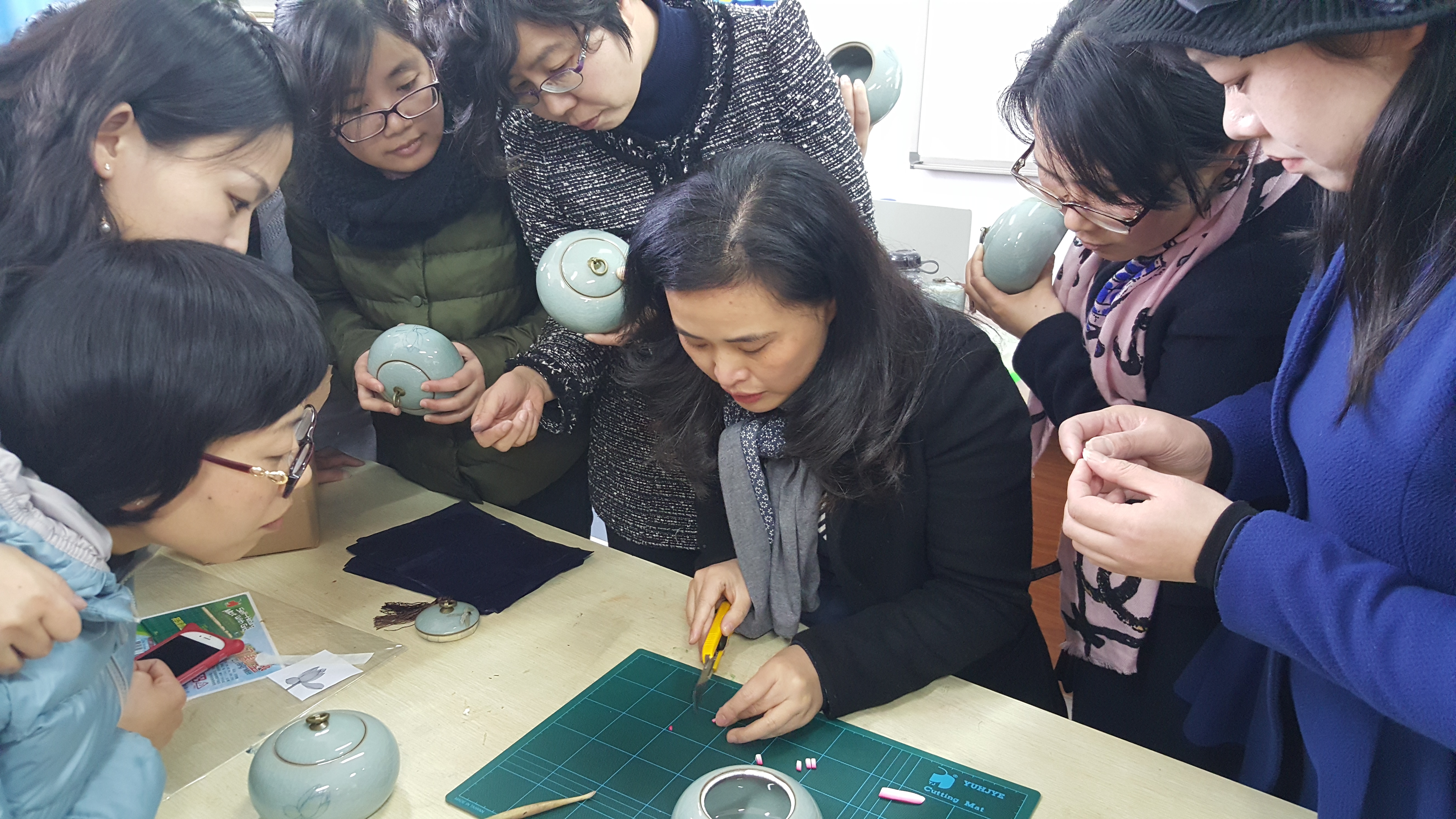 活动一开始,陈铿老师先向大家简单介绍了瓯塑的工艺特点和制作手法,然后每位老师领到了一个青瓷罐子和需要的瓯塑材料与工具。制作的第一步是在在青瓷罐子上描上图案,第二步是在图案上涂上胶水,第三步是选取瓯塑的特殊材料——油泥,第四步是把油泥揉搓成需要的形状,第五步是把揉搓好的油泥粘到罐子上,然后用特殊的工具压制、定型,一件美丽的彩色浮雕作品就完成了!接下来只需把它放在阴凉干燥处阴干就行了。在制作过程中,有的老师是在陈铿老师手把手的指导下完成的,有的是独立完成的,也有的老师比较有想象力,别出心裁地进行着自己的创作。最后制作出来的作品虽然还显得稚嫩,但全都色彩鲜艳,别有风采。