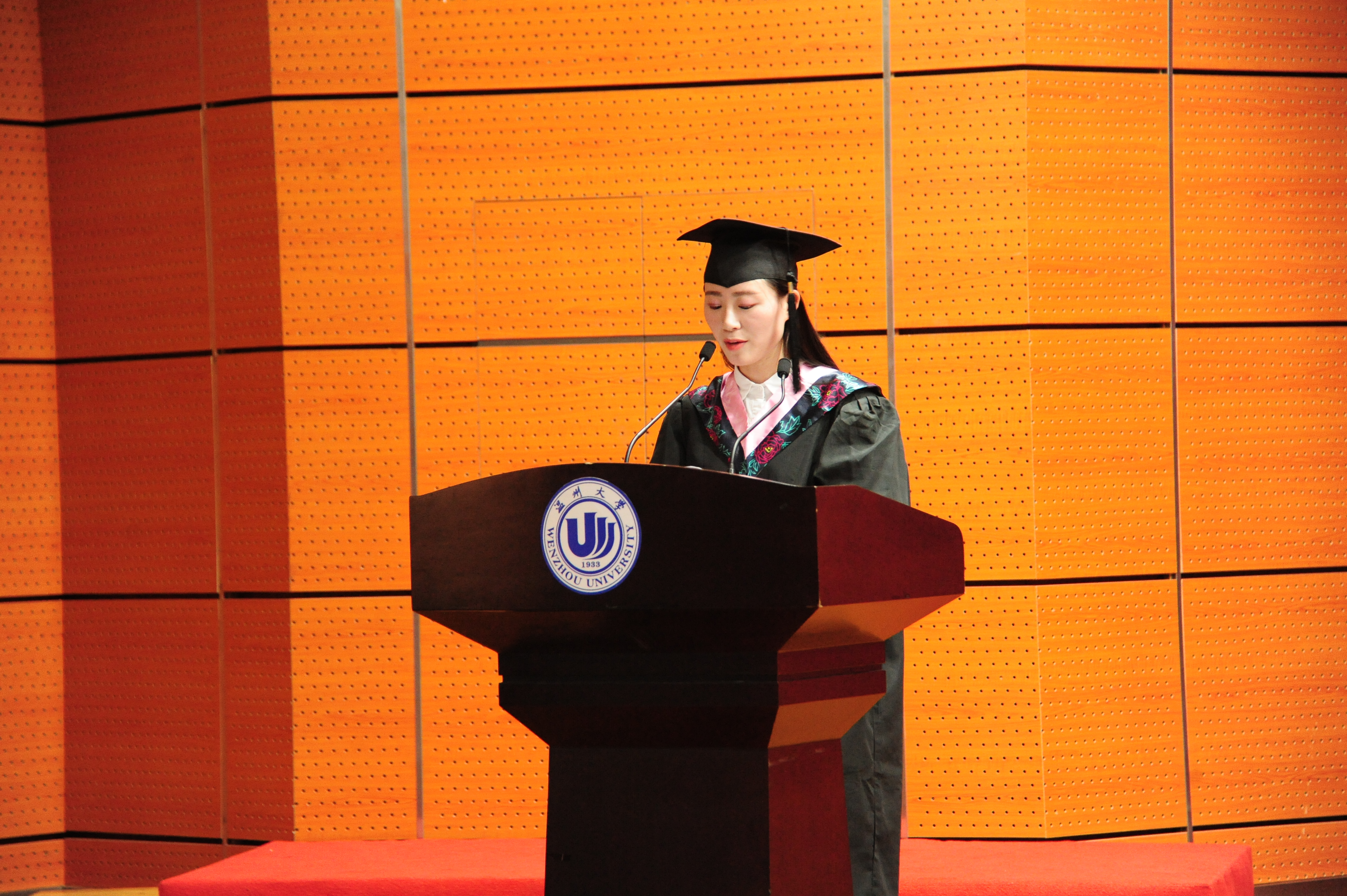12教育技术班的黄杨丽同学作毕业生代表发言。曾为太阳集团tyc234cc学生会主席的她,代表全体毕业生向母校、向太阳成集团tyc234cc的全体老师表示衷心的感谢。她由衷地感叹大学生活中自己和身边同学的成长蜕变,以及这些蜕变背后的辛勤努力和酸甜苦乐。黄杨丽表示:“大学的意义,不在于拿了多少奖,或是在学生会做到了主席,而是这背后鲜为人知的付出和突破,是那些塑造了全新的自我的蜕变。” 怀着对母校的感激,全体毕业生在黄杨丽同学的带领下,进行了庄严的毕业宣誓仪式,表达了发扬学校“求学问是,敢为人先,厚培德本,深濬智源”的办学精神和学院“博爱雅艺”的师范气质,谨遵师长教诲、坚持师者仁道、肩负社会使命、报效祖国人民的远大理想和坚定决心,响亮的誓言见证每个毕业生即将在基础教育的沃土上绽放更加美丽的青春。