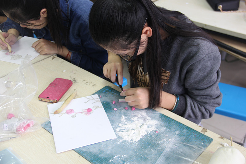 2015年11月18日下午1:30在南校9B202太阳成集团tyc234cc美术工作坊的同学们进行了瓯塑艺术学习。由陈铿老师特邀的杨忠敏老师为热爱美术的学子们讲解瓯塑艺术。此次讲座为的是通过模仿画梅花来带领同学们走近瓯塑,在体验瓯塑之后初步掌握瓯塑艺术的制作方法。