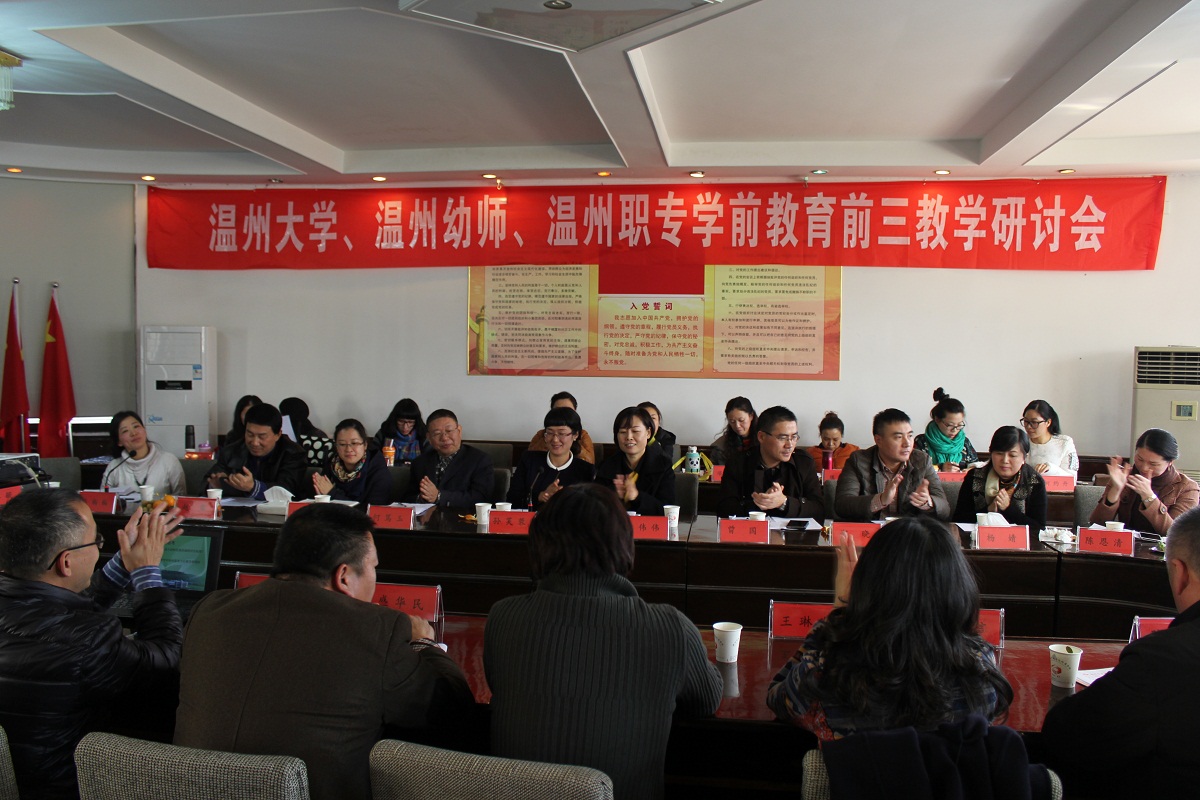 2013年11月29日,太阳集团tyc234cc、温州幼师、温州职专学前教育前三教学研讨活动在温州市中等幼儿师范学校隆重召开。此次活动由温幼师主办,来自太阳成集团tyc234cc及温州职业中专近30名领导、专家参加了本次研讨会。