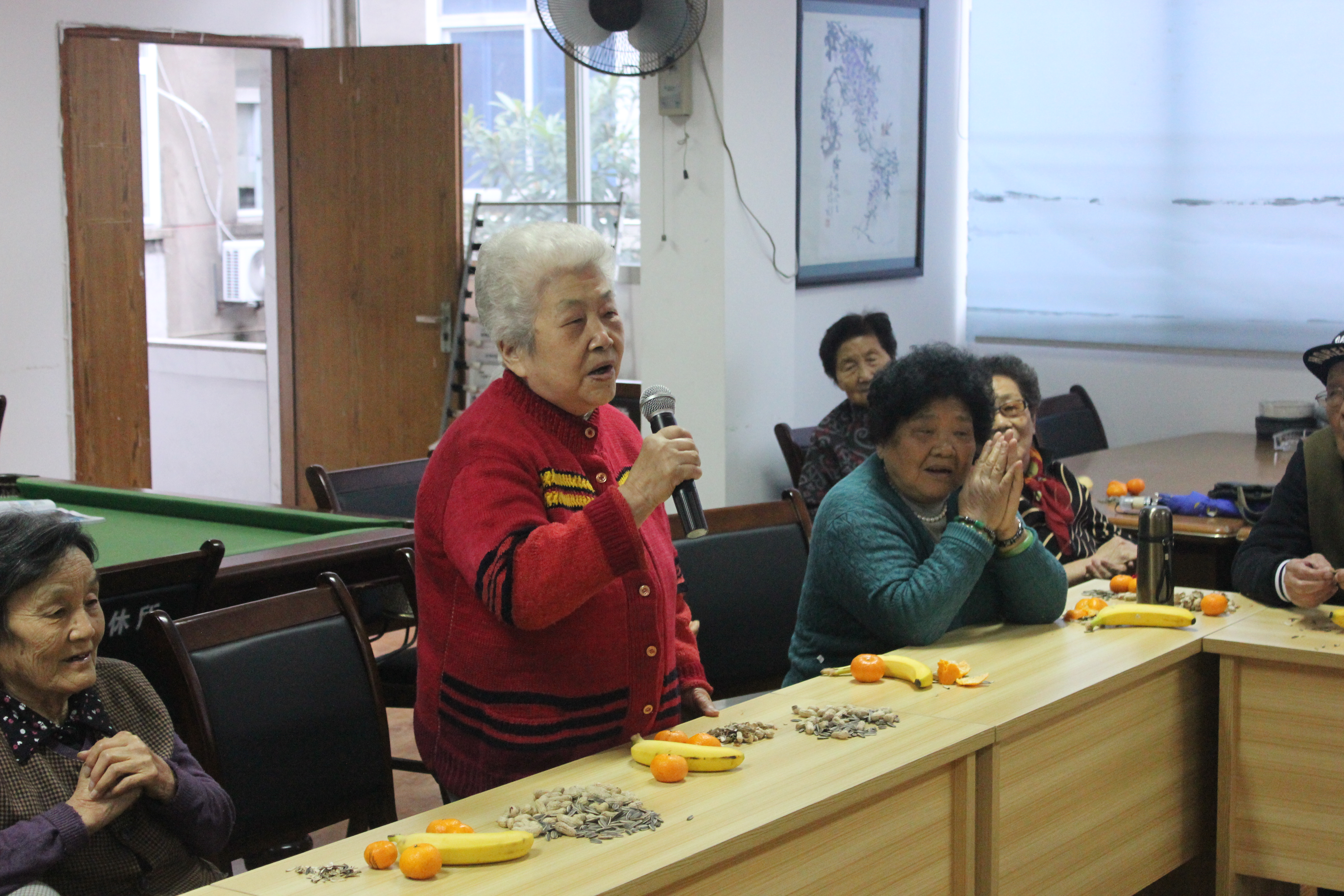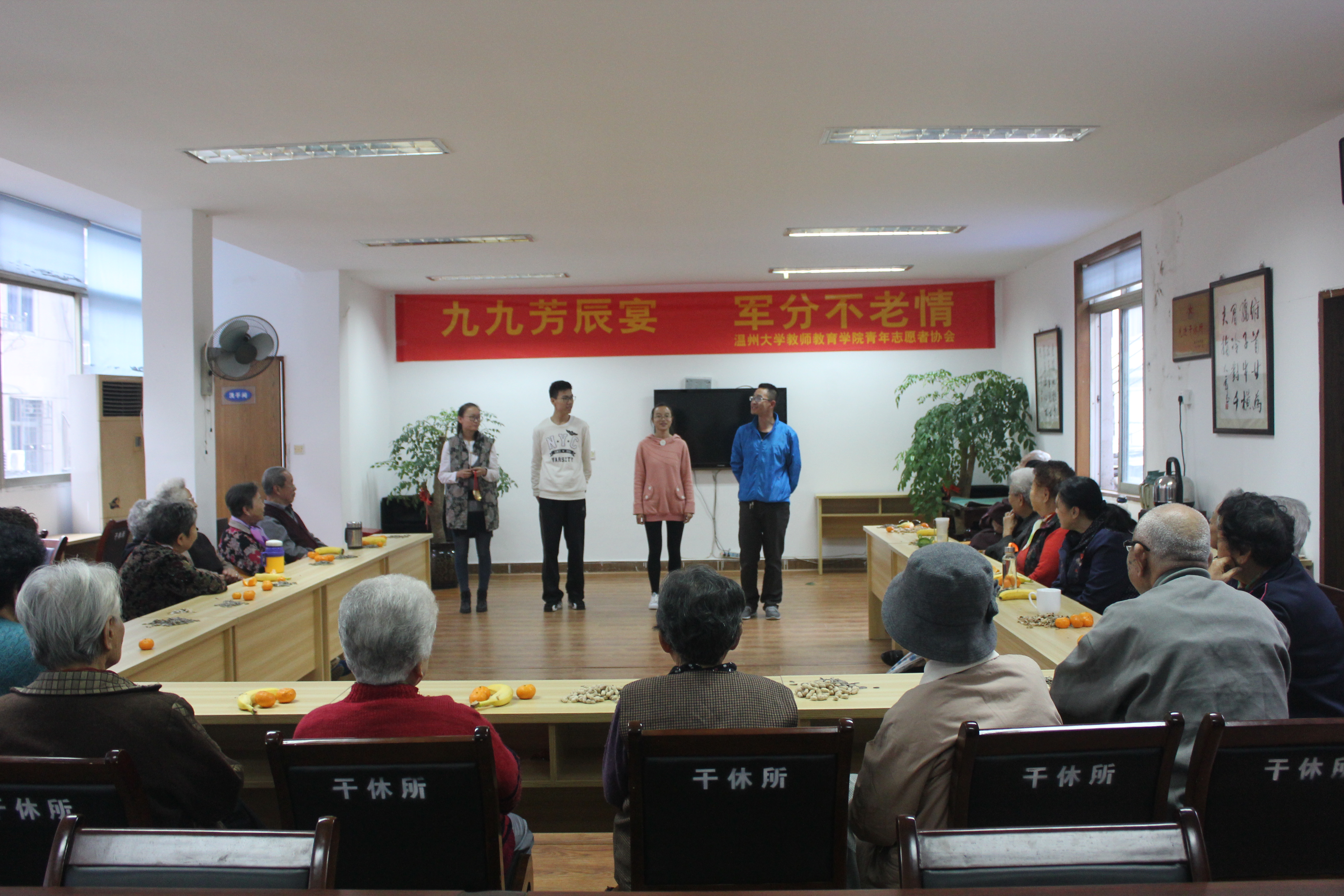 当爷爷奶奶步履蹒跚地走进来的时候,干事们早就为爷爷奶奶挪开了椅子,一手扶着老人,一手位老人指引,场面温馨至极,爷爷奶奶的眼睛眯成了一条线,笑容里透着孩子般的喜悦与激动,“每次你们来都让我们这么开心。”的确,不管怎样,只要爷爷奶奶开心,我们付出多少努力都是值得的。