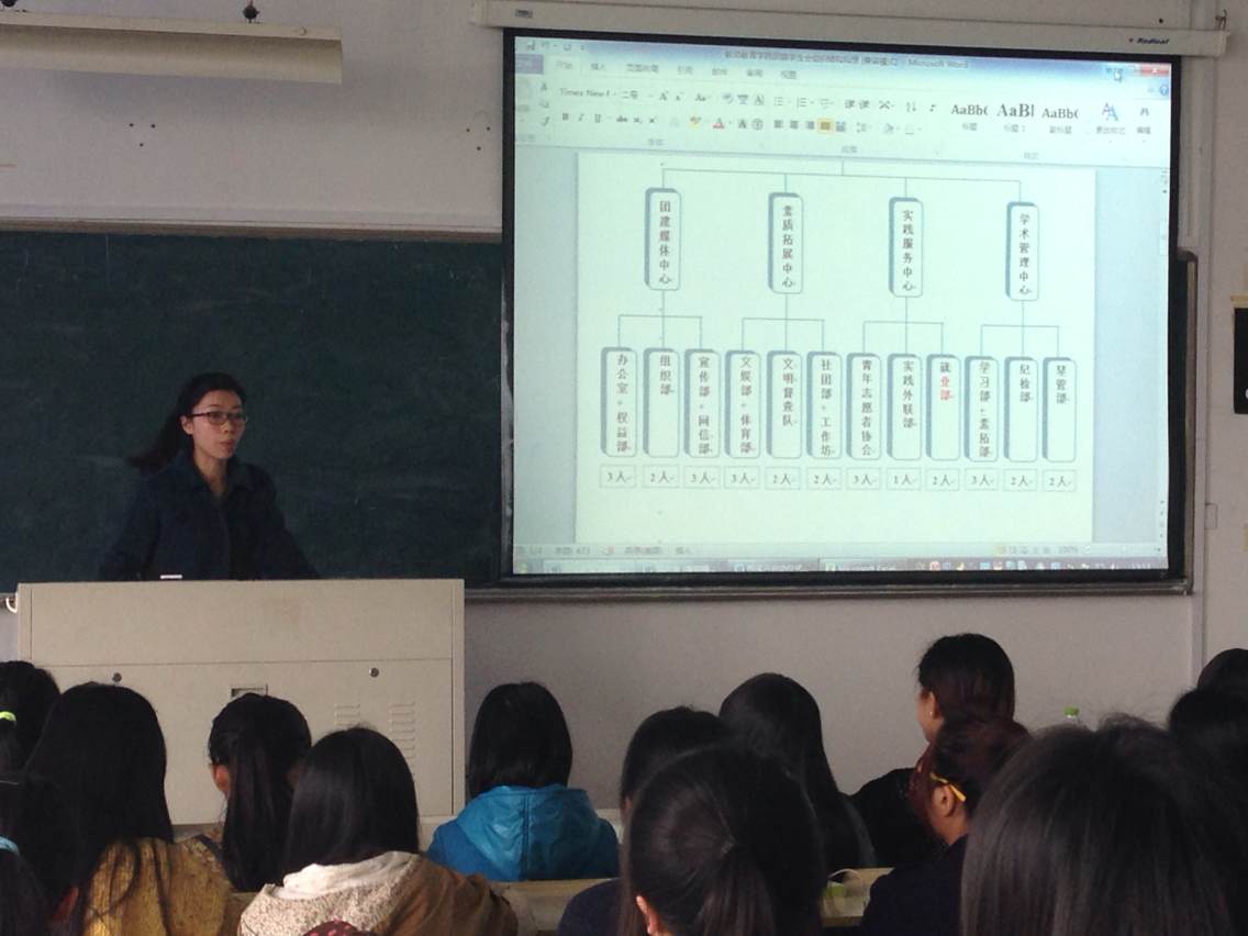 会上,首先由陈秀雅老师发言。她针对学区制改革,强调我院将把工作重心集中于学生建设、学生科研、就业创业和团学部分工作上,就此引出了本次会议的中心“我院团委学生会部门改革”。此外,陈老师就干事们一个多学期来的辛勤努力表示感谢,并鼓舞大家在积极工作的同时要抓好学习。