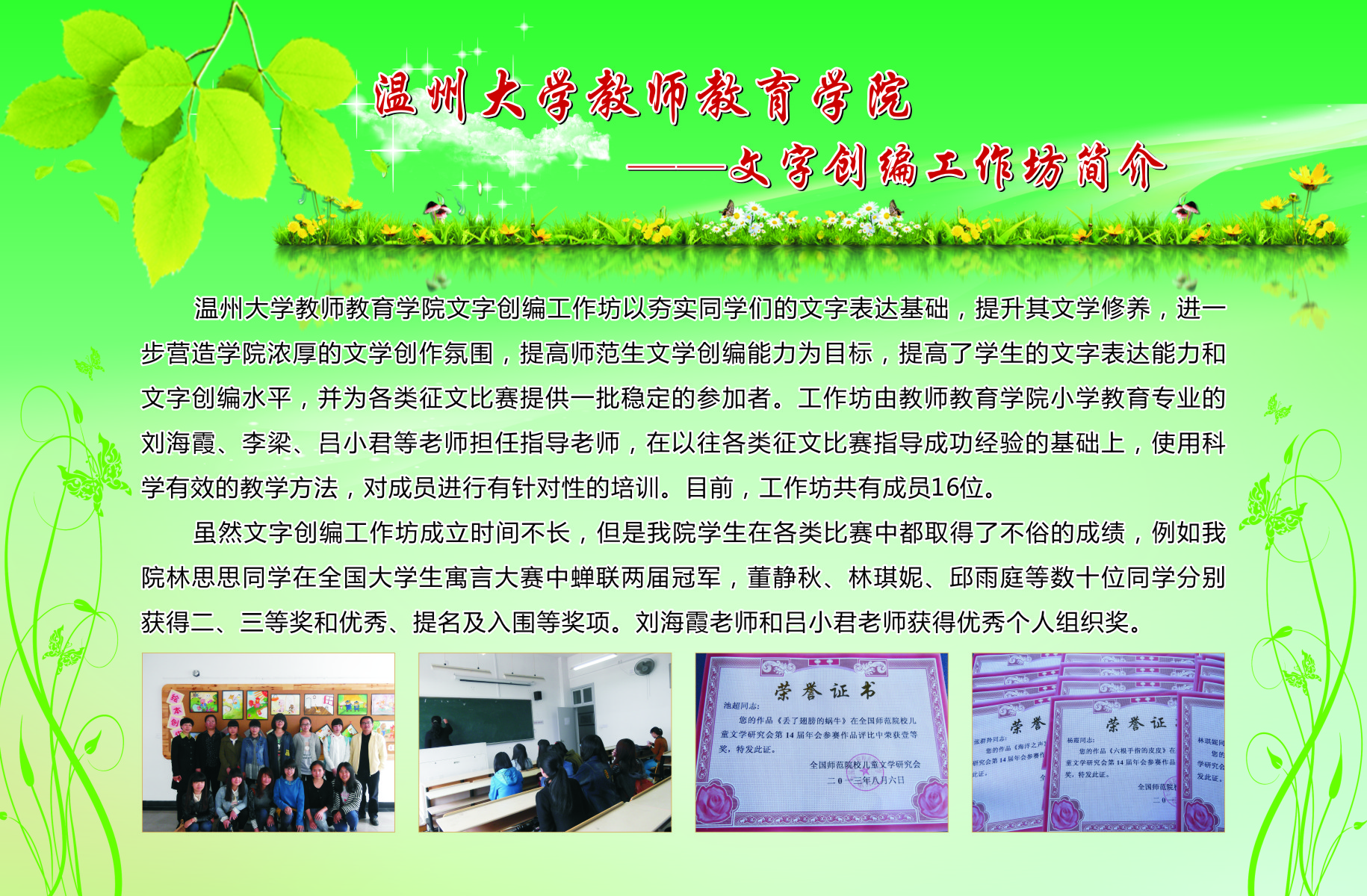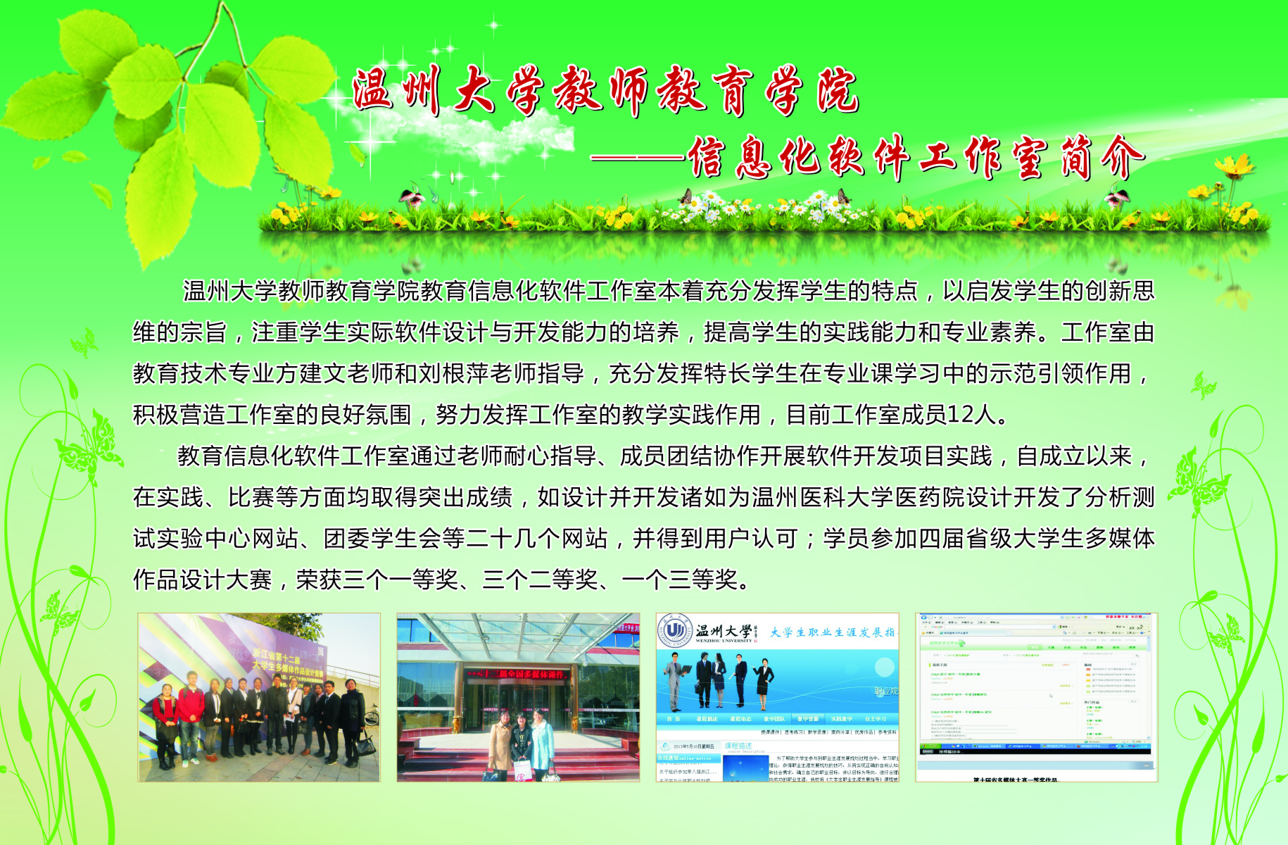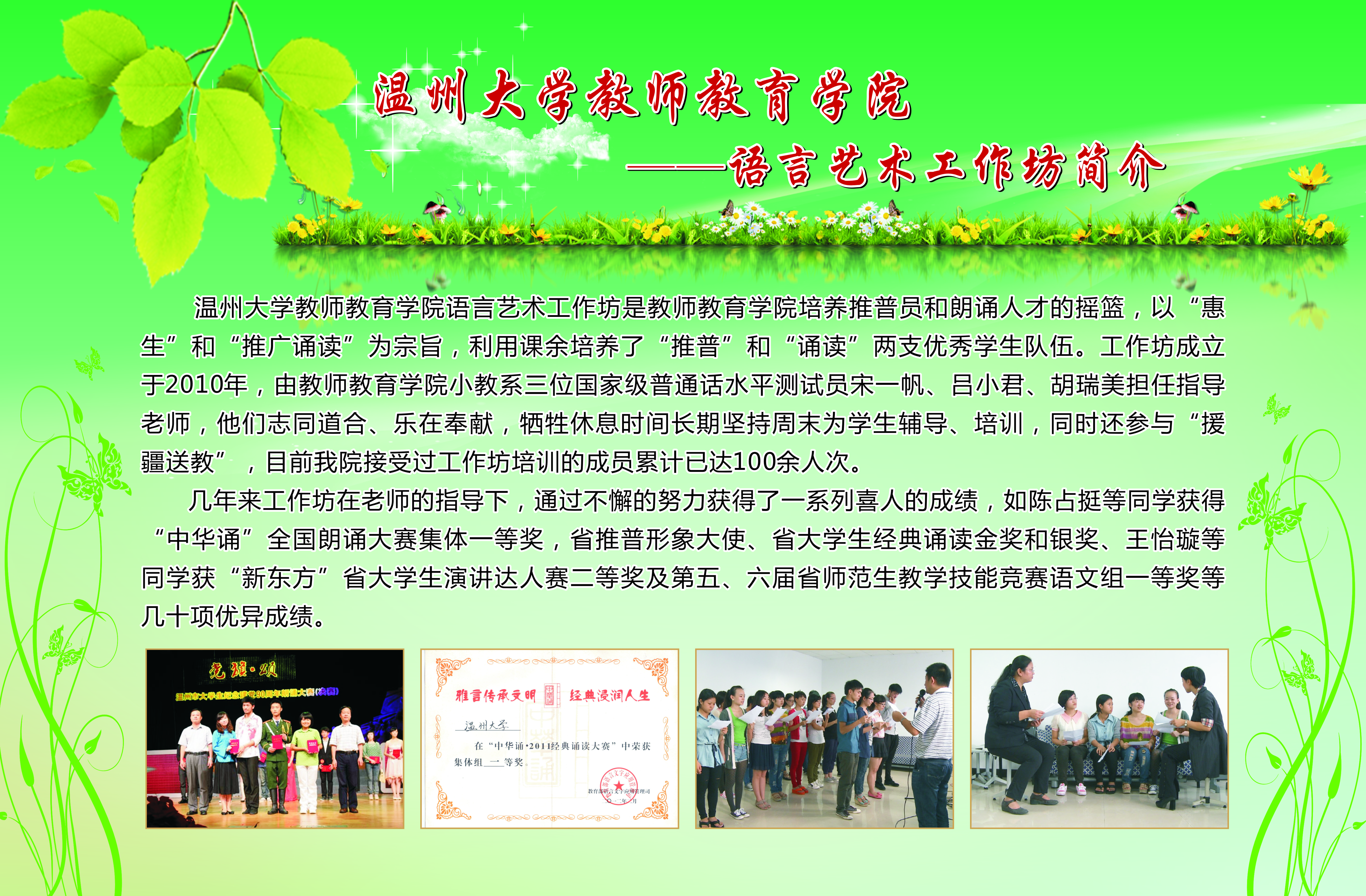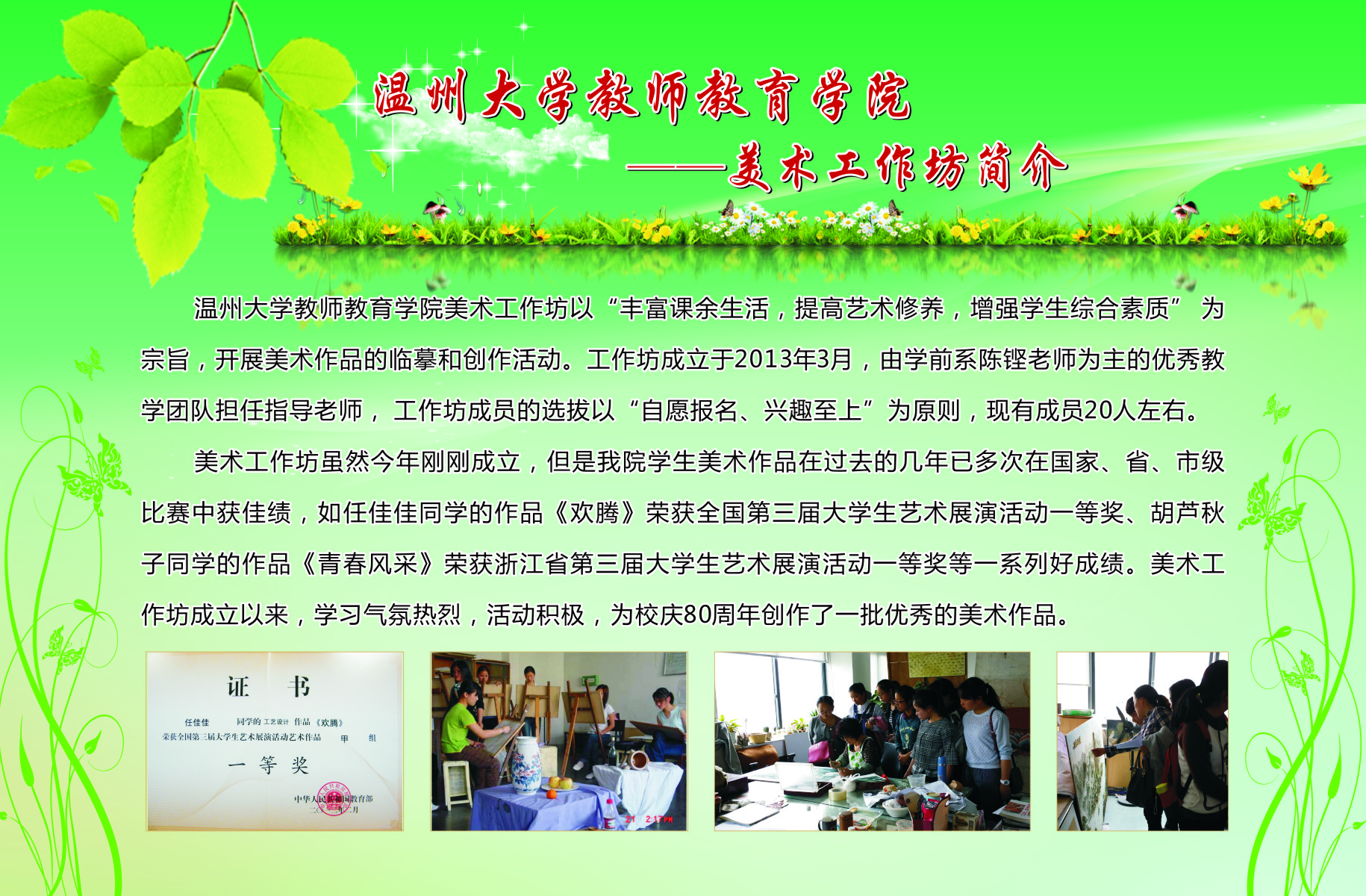 近些年,太阳成集团tyc234cc学生工作以培育学生“博、爱、雅、艺”师范气质,深化学院优良学风建设,提升学院服务地方的能力为宗旨,创办了一系列的学生专业工作坊。从09年开创至今,学院工作坊数量逐渐扩大,目前已拥有语言工作坊、儿童剧剧社、书法工作坊、合唱工作坊、新媒体工作坊、软件工作室、摄影摄像工作室、表演唱工作坊、心理测量工作坊、美术工作坊、舞蹈工作坊、文学创编工作坊、情感工作坊等13个学生专业工作坊。为进一步推进我院学风建设,发挥先进典型的示范作用,展示我院师生在“博、爱、雅、艺”方面的精神风貌,我院特举办此次学生专业工作坊宣传展。