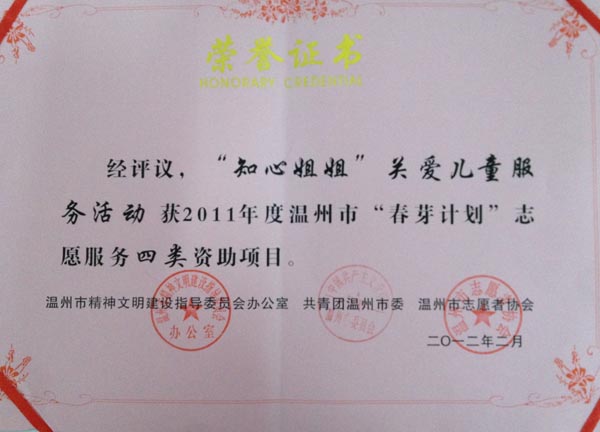 35上午,温州市“春芽计划”志愿服务资助项目表彰大会在市青少年活动中心召开,我院“知心姐姐”荣获2011年温州市“春芽计划”志愿服务四类资助项目。