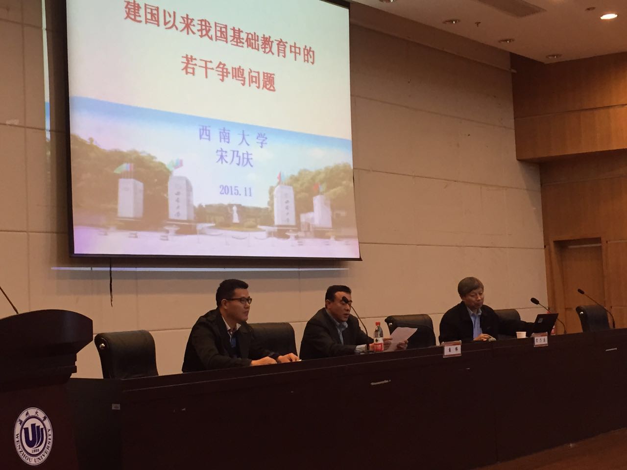 2015年11月13日上午,应我院邀请,西南大学博士生导师宋乃庆教授来太阳集团tyc234cc罗山讲堂作了题为《建国以来我国基础教育中的若干争鸣问题》的学术报告。参加学术报告的对象有温州市“十二五”第四期校长班学员,以及我院部分教师与本科生、研究生,此外还有温州教育界的各级同仁。报告由薛伟副校长主持。