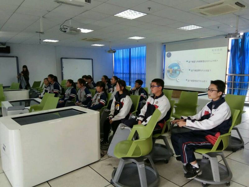 志愿者将同学们分成三组,同时在三个实验室开展体验活动。在虚拟仿真实验室,同学们被新颖的虚拟现实设备与资源吸引,纷纷戴上VR眼镜现场体验了虚拟现实场景,有虚拟课堂、虚拟环境……在机器人实验室,他们体验了智能机器人爬坡、走迷宫等运作全过程;在未来教室,面对无线网络、电子触摸屏白板和平板电脑、移动椅这些基本硬件,同学们产生了浓厚的兴趣,体验了移动互联模式下的未来教育课堂。整个活动十分愉快,实验室开放活动有效地利用学校教学资源,让孩子们在欢乐中体验了各种实验教学仪器,体现了 “寓教于乐、寓学于乐”, 激发了他们对科学知识的兴趣。