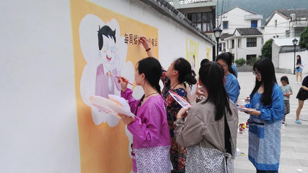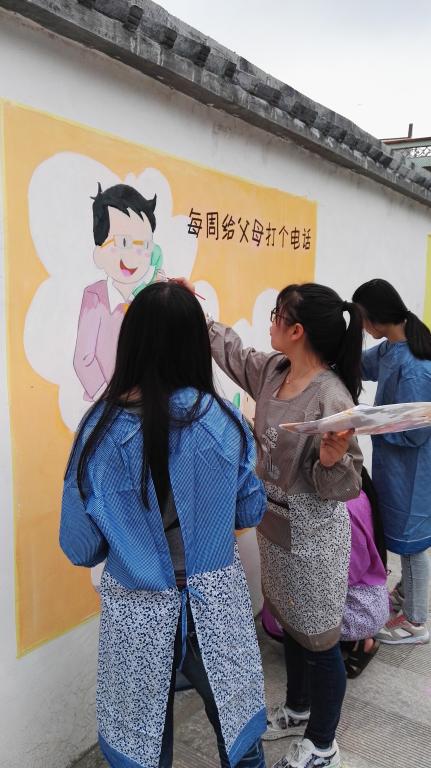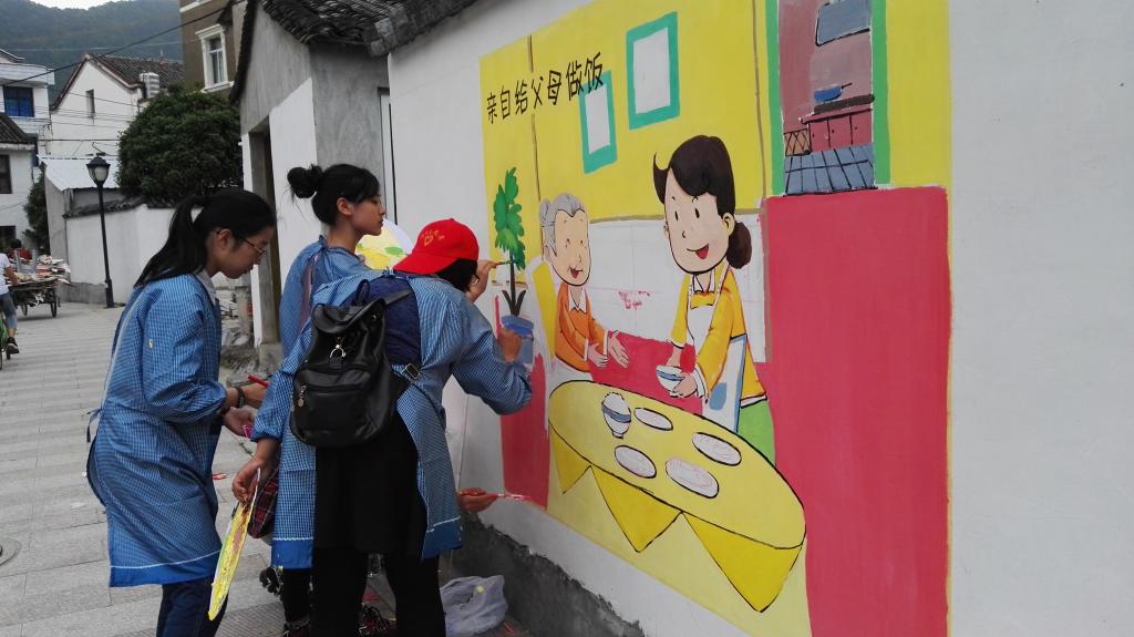 5月4日下午,由太阳成集团tyc234cc和美术与设计学院共同发起“弘扬传统文化 共建美丽乡村”活动再次吹响五四青春的号角。由太阳成集团tyc234cc美术工作坊指导老师陈铿和学生科严晓秋老师带队,30余位学生志愿者,前往乐清虹桥镇大乌石村开展公益墙绘活动。