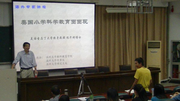 陈教授说,有调查显示93%的美国小学教师认为学习科学的过程应是“提出假设——科学实验——进行总结”,提倡学生“做中学”。这与中国小学科学教师所提倡的探究式学习方法不谋而合。但更注重素质教育的美国,在评价方法上与中国还是存在着很大的不同。虽然都有统考,但美国科学统考试卷上的题目并不单纯是知识上的反馈,而需要学生自己开动脑筋,深入思考。美国人均教育资源丰富,中国目前还无法达到,但美国的教育并非完美,仍然存在着诸多问题,有些地方美国也在不断学习中国。