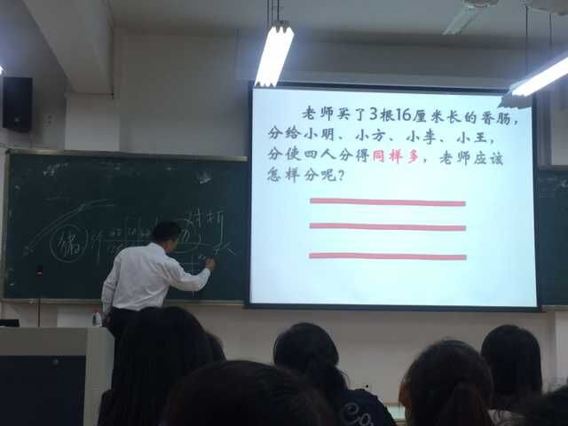 陈加仓老师首先谈到吃透教材的重要性。他列举了马丁加德纳和苏步青等名人的话,来说明在配合小学数学课本,适当有目的的添上引人入胜的东西,循循善诱,更能拓展孩子学习时空,激发孩子思考,提高数学素养。接着陈老师介绍了拓展课的内涵——“源于教材,宽于教材,高于教材”。以此来创设问题情境,提供活动空间。紧接着,陈老师就拓展性教学课例在实际二年级数学课堂教学中如何有效并获取成效展开了讲述。他选取了几个典型的引导例子“做月饼分月饼”,“兔子跳跳跳”等从这个问题逐步引申到思维型强度大的情境中,数据由小变大如何让二年级学生理解这一知识点。在谈到经典的鸡兔同笼问题中时,陈老师采用了学生画鸡兔,来引出问题,通过自己动手寻找来获取答案。从这些实例教学中,告诉我们动手做模型,画图等都是分析问题是的好工具。而作为一名小学教师还需注意的是怎样利用话语来引导学生用不同的方法来解决问题,举一反三从不同角度去剖析一个问题,从讨论中获得答案。在小学教材的利用上,陈老师提到两点:1. 挖掘教材上拓展点;2. 巧用课堂生成资源。如长方形铁皮改为正方形铁皮进行研究,发现其中的内在规律,这就是有限的课本中挖掘出更深层次的数学探究与初中教学慢慢接轨。最后由小教系章勤琼老师进行了总结:作为一名大学生,在看到不同的数学题下,还要知道这些都试试运用了什么数学原理,要帮助学生树立什么数学思想,这都是值得我们思考的问题,更重要的一点就是利用好自己的时间多读书拓展自己的知识。