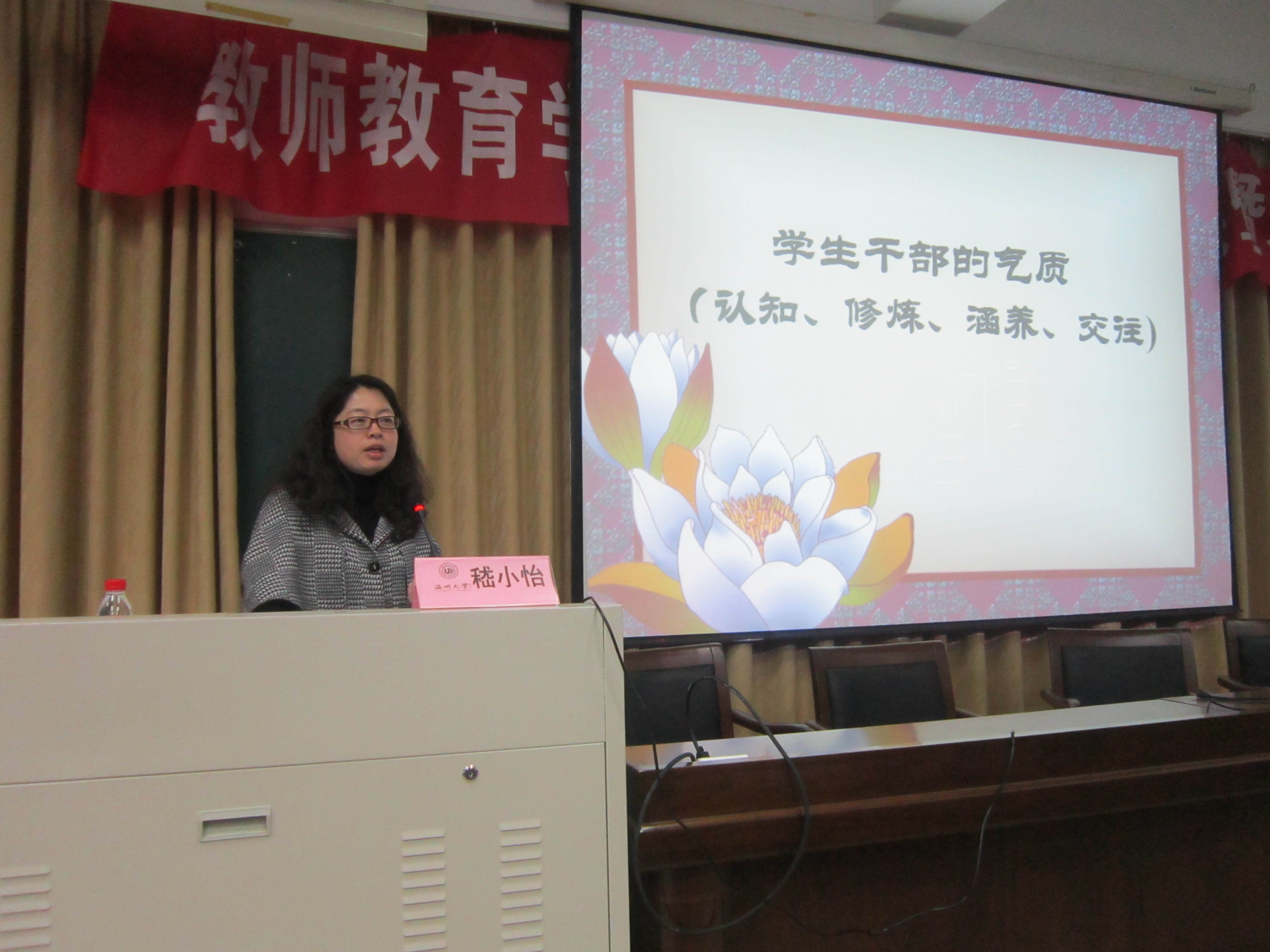 2013年3月27日晚上6点30分,太阳成集团tyc234cc2012--2013学年第二期团学干部培训讲座在北校3号楼101教室开展,本次讲座的主讲人是太阳成集团tyc234cc党总支副书记——嵇小怡老师。