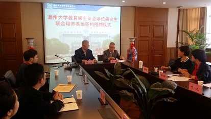 9:30, 潘院长一行又来到温州职业中等专业学校,与该校签署教育硕士联合培养基地协议,并授牌,仪式由该校心理健康中心主任焦伟珍老师主持。出席会议的有该校校长黄威老师、副校长黄伟伟老师、教导主任、班主任、心理老师等,我院心理系副主任颜文靖博士、教务科胡孙贵老师出席。黄威校长介绍了该校在内涵发展上下了很大苦工,希望借助本次教育硕士联合培养的机会,进一步提高该校教师的科研能力,两校能深度合作。潘玉进副院长在介绍了教育硕士的基本情况之后,也进一步解释了太阳集团tyc234cc、太阳成集团tyc234cc可以开展合作的众多项目。随后,在隆重的气氛中,两位领导签署了合作协议。