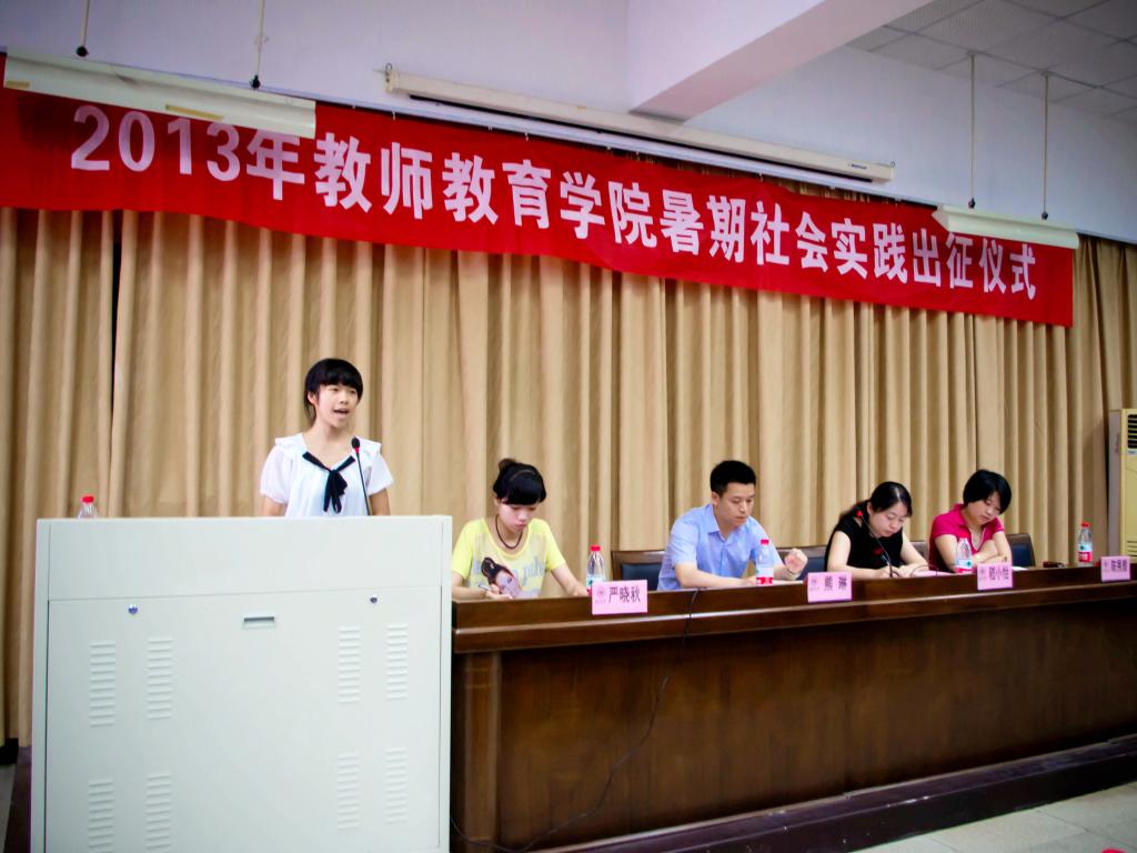 会上来自11应用心理学本的学生代表黄唯佳发言。她表示今年的暑期社会实践在形式和内容上都有所丰富,且每支队伍创新性地开展调研,做到理论和实际相结合。随后来自12小教科学的罗博文同学领誓,全体队员庄严宣誓,铿锵誓词饱含每一位队员的热情和信念。宣誓完毕,由学院党总支副书记嵇小怡为实践总队授旗。高高飘扬的实践队旗,昭示着我院2013年暑期社会实践踏上新征程!