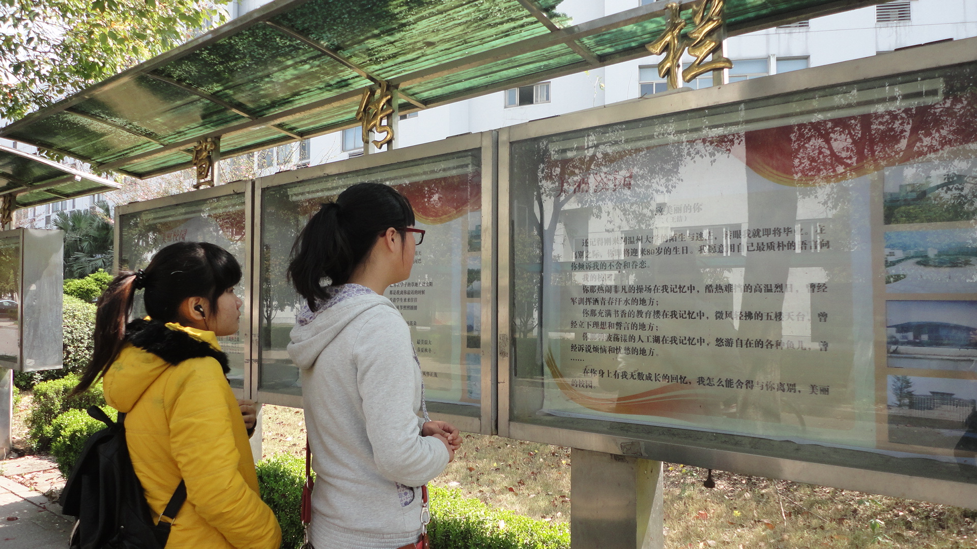 为了迎接80周年校庆的到来,我院开展了“校庆号微庆祝活动”。我院学子们在2012年12月至今年5月期间的每月19日,以“喜迎校庆”为主题开展微庆祝活动:2012年1月19日的活动为诗文微作品展,接下来,学院还会在每月19日举行书法微作品展、摄影微作品展、诗歌朗诵等微校庆活动。近日,我院学子校庆微诗文展在北校宣传栏展出,取得了良好的反响。许多师生驻足观赏、品评。