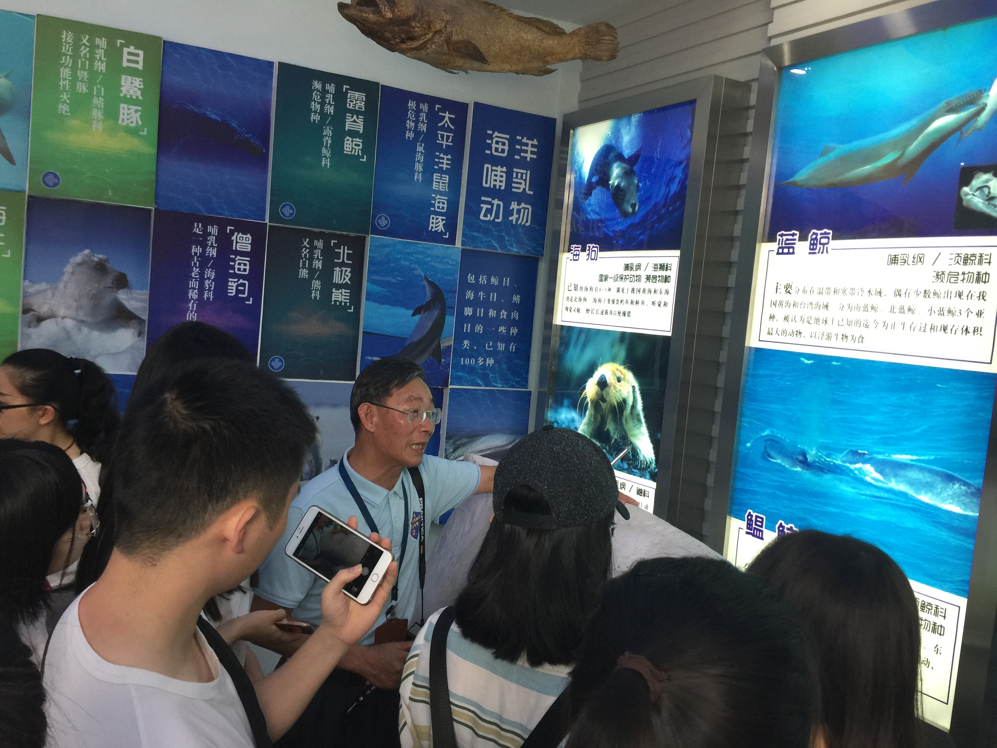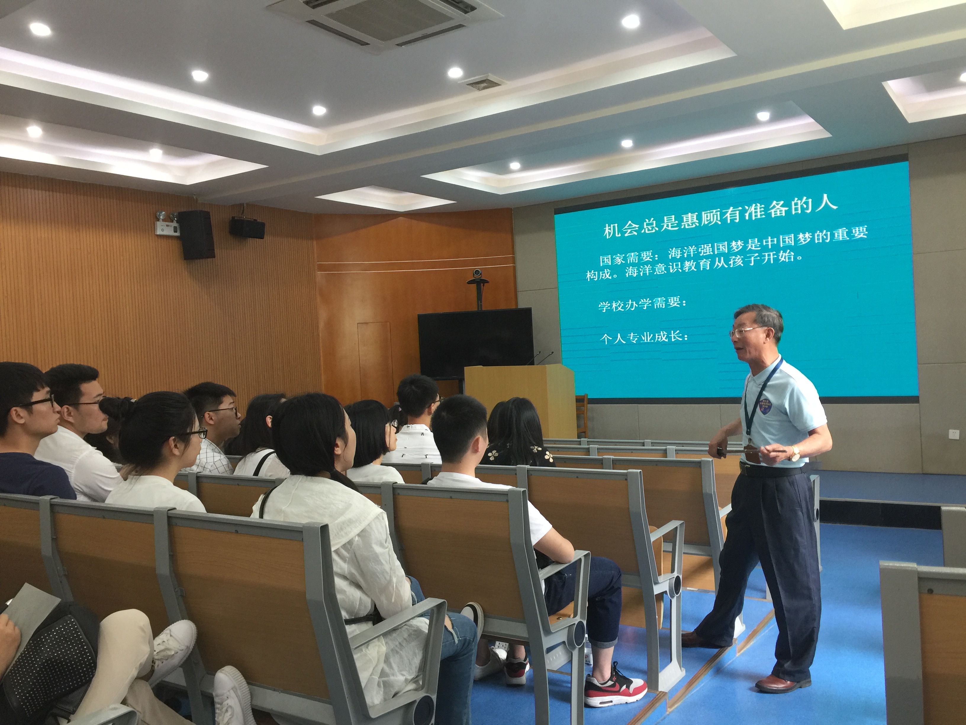 在附中倪子伟副校长的引导下,我们参观了该校的校园环境和海洋珍稀动物馆,了解了该校以海洋为特色的办学理念,感受到了其浓厚的科技文化氛围。之后同学们聆听了由高级教师周钟法老师做的《突出科技特色,创新海洋教育》的专题讲座。周钟法老师知识渊博,言语风趣,现场氛围十分活跃。周老师从学校举措、海洋教育内容举例、教师专业化发展三个方面深入展开论述,深刻阐明了海洋教育的重要地位,强调了海洋强国梦是中国梦的重要构成,海洋意识教育要从孩子开始。“自信乃人生之本,顽强是自信的忠实来源”,最后周钟法老师无私地将他这句人生励志格言分享给在座的未来准教师们。对于此次讲座,大家都感到醍醐灌顶,获益匪浅。