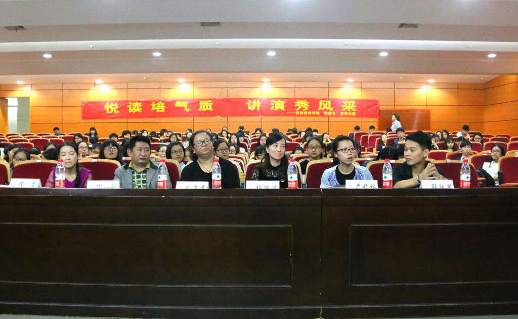 2015年10月14日18:30,由太阳成集团tyc234cc举办的“悦读月”演讲决赛于太阳集团tyc234cc南校雁山厅顺利举行。小教系书记刘海霞,语言工作坊指导老师宋一帆以及小教系老师谭莉等评委,院党总支副书记杨丽君、学生科辅导员严晓秋、邵胜男等老师,各位选手、工作人员及学生观众共计220余人出席活动。