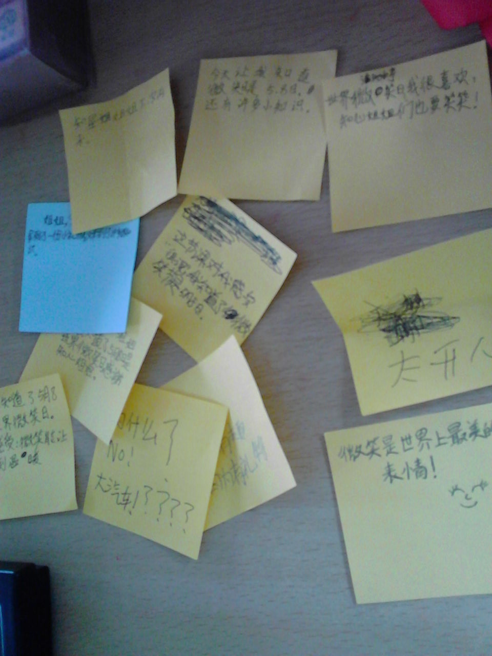 最后一个环节是介绍世界微笑日,让孩子们对这个特殊的节日有所了解,并且用自己的巧手画出微笑的脸庞,写下自己的感受。在孩子们写下自己在这节课中的收获之后,“……希望孩子们以后能够微笑着对待身边的每一个人……”在主持人的话语声中,我们这次的知心班会活动就到此结束了。