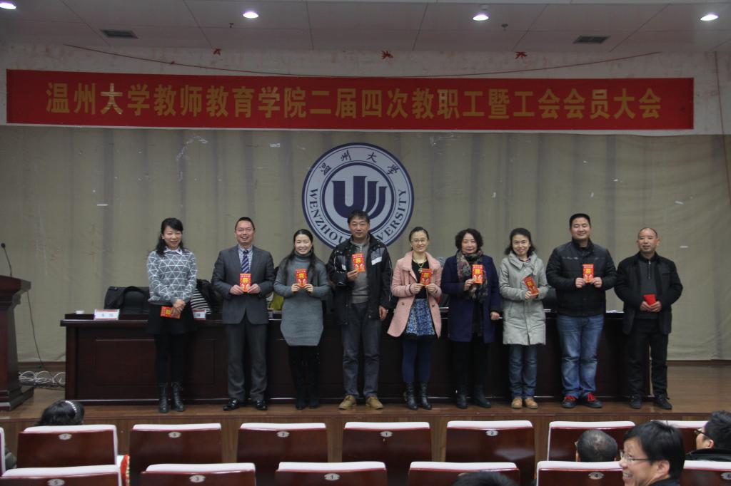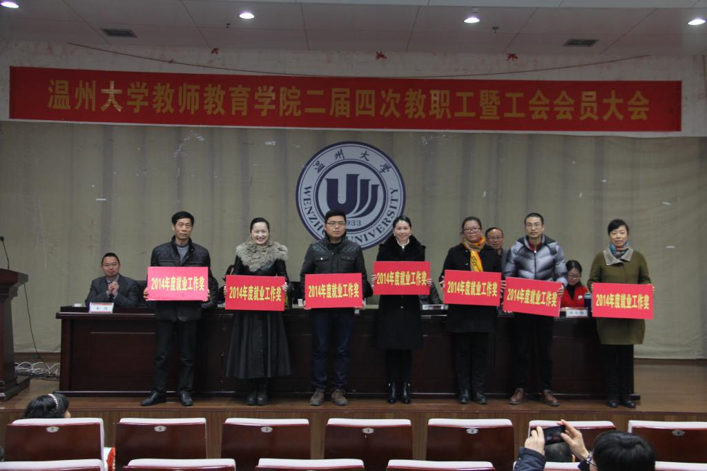 在颁奖环节中,学前教育系艺术教育团队、教师教育实验教学中心荣获2014年度“院长特别奖”;杨健、刘海霞、金建钰、陈恩清、陈旭微、章春和、朱江海等七位老师及就业专职人员因就业工作突出荣获就业工作奖励;金荣乾、郭文斌、朱伟、张龙、胡丹、胡雯、卢佳、李伟、谭莉等九位同志获得了工会活动积极分子的荣誉称号。