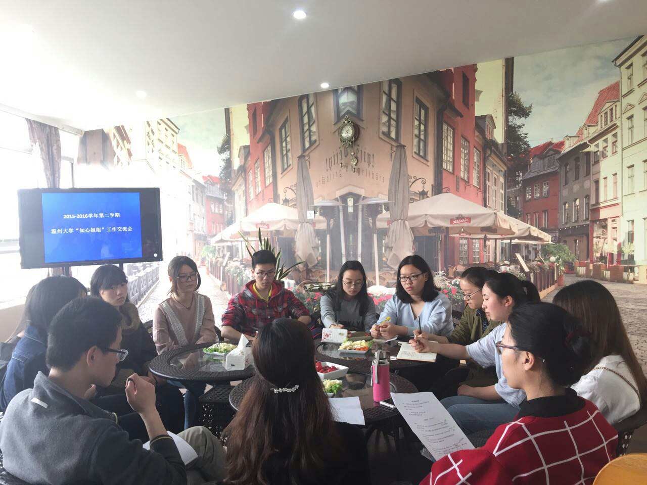 2016年4月7日,我院“知心姐姐”志愿服务队工作交流会在学院四楼“十亩之间”召开。我院党总支副书记杨丽君、学生科辅导员严晓秋、知心队长以及部分队员参与了会议。本次会议旨在总结上学期活动情况以及针对活动中出现的问题作出相应解决方案。