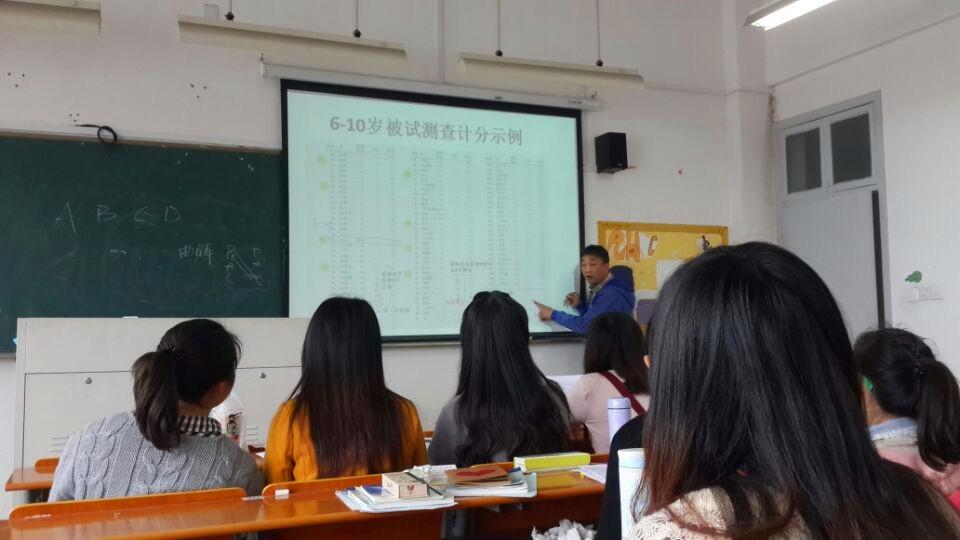 两位老师详细地讲解了对特殊儿童尤其是自闭症儿童和智障儿童进行测试的注意事项:首先,要注意排除有刻板行为的儿童;其次,要关注儿童的注意力是否集中在测验工具上;第三,要注意对特殊儿童在测试过程中及时予以适当的强化,鼓励他们能够继续进行测验;第四,最好选择特殊儿童熟悉的环境,并要求父母或者个训老师陪伴;第五,当遇到特殊儿童情绪不佳时,暂时停止测验,等其情绪平稳后再继续测验;第六,开始测试特殊儿童时,最好能够在观摩老师测验之后,两个同学一起配合完成测验,积累特殊儿童测验的经验。