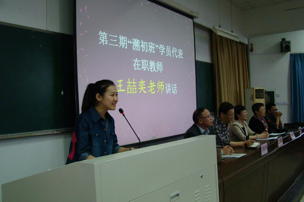 此后,“溯初班”第三期优秀毕业生,现任职于海宁一中的王喆奕学姐就“溯初班”的学习经验结合新老师的一些感悟对新学员提出了几点宝贵的建议。她指出,在校期间我们要疯狂阅读,时时积累;在职期间我们要理解教材,坚持理想。我们要用理性的分析去选择自己的未来,并用热切的期盼去相信自己所选择的未来,永不言弃。