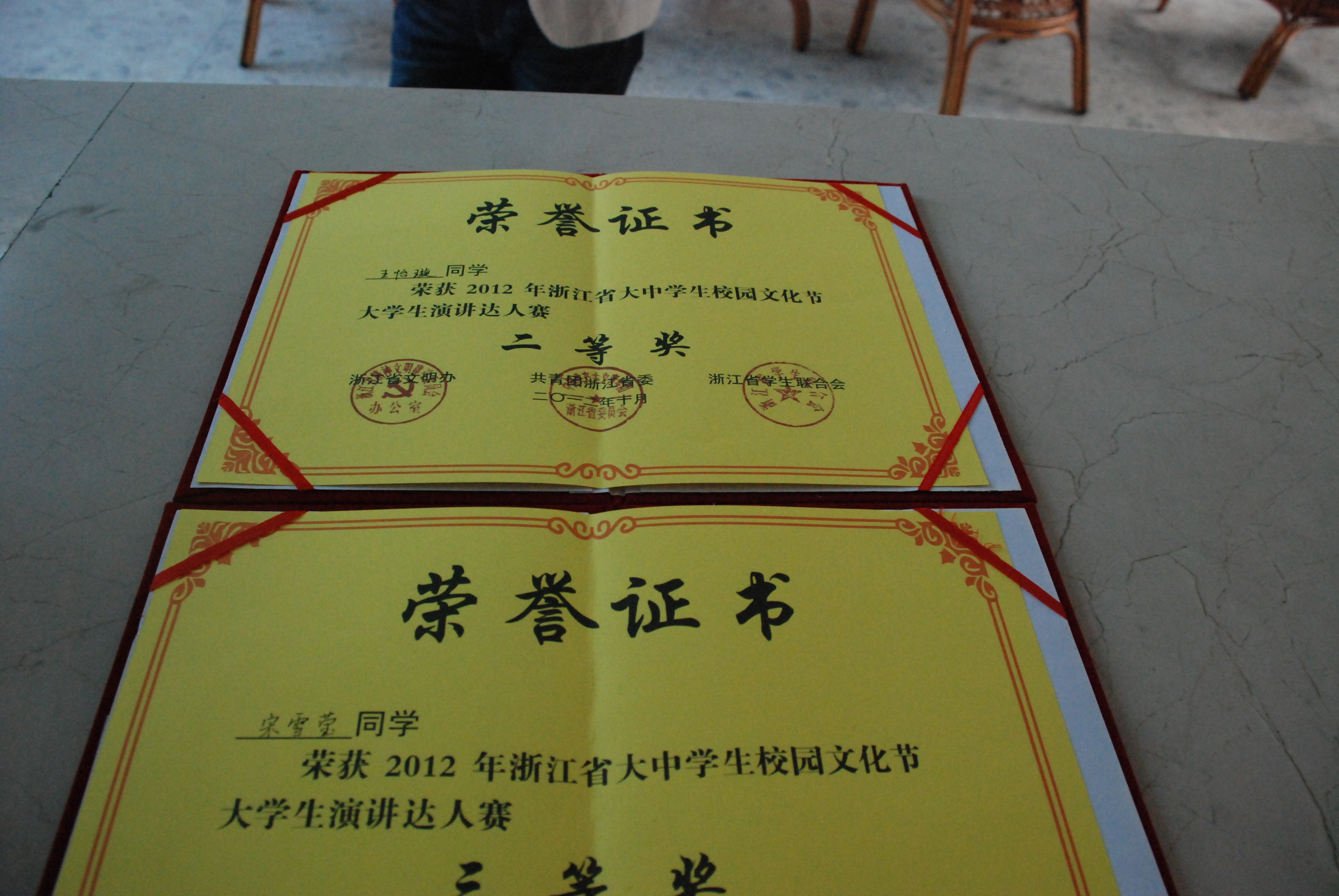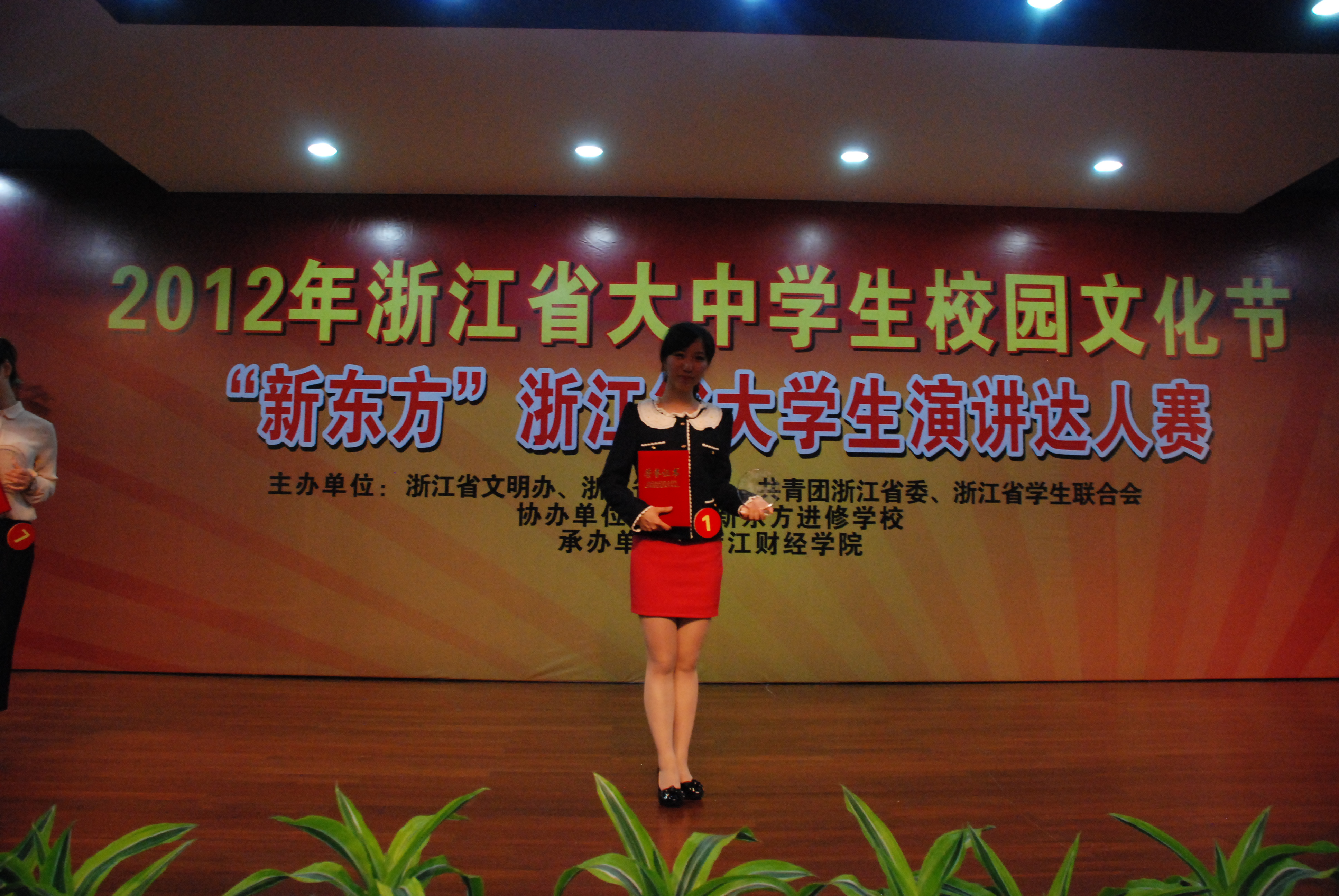 2012年10月19日,“新东方”浙江省中学生演讲达人赛在浙江财经学院下沙校区举行。我院王怡璇、宋雪莹两位同学在初赛阶段脱颖而出,代表学校参加复赛、决赛。10月19日上午,大赛进行封闭式命题复赛,下午进行即兴演讲决赛。经过激烈的唇枪舌战,王怡璇同学最终荣获大赛二等奖,宋雪莹同学荣获大赛三等奖。